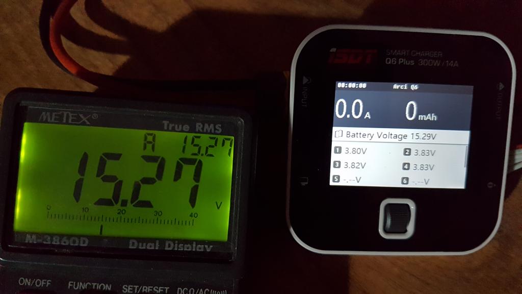 Do této chvíle je aktuální stav počítadla nabitých akumulátorů na čísle 188 kusů, bude jich podstatně víc protože na letišti nabíjím po dvou kusech v paralelní desce. Láduji s tím akumulátory od 3S 1300mAh po 6S 4000mAh, proud od 1,3A po 13A.. Každopádně pokud chcete využít všech 300W nabíječe je nutné ho napájet vyšším napětím. Při napájení 12V zdrojem je ochotný do 6S ládovat výkon 175W. Pro plné využití je potřeba zdroj 27V 14A (používám průmyslový 24V 14A jen je trimrem natočeno 27V). Pokud jde o přesnost měření tak jsem spokojen, dále to nebudu komentovat protože nemám k dispozici měřák o kterém bych mohl říci že měří "přesně" , moje měření je na fotkách.. LCD je parádní tam není co vytknout, krásně čitelné ve slunečních brýlích na přímém slunci. Ovládání rotačním enkodérem je pohodlné a rychle se na to zvykne. Co bych vytkl je ventilátor, ten je celkem hlučný (je to prcek tak jede jak blázen).. Při nabíjení 3S proudem do 3A se nepustí ovšem pokud se přidá na 9A tak už v cyklech spíná, je sice regulovaný, ale moc to nefunguje, začne na 100% a pak postupně ubírá dokud neklesne teplota, dále se vypne a děj se po nahřátí opakuje.. Velký vliv na spínání ventilátoru má i rozjetí packu, čím víc balancuje tím víc chladí.. Jinak chlazení funguje, na letišti je na přímém slunci, 300W výkon do 6S packu a nepřehřívá se, teplota se pohybuje kolem 55°C. Zpracování nabíječe hodnotím jako velmi dobré, jak po designové stránce tak mechanické (uvnitř jsem to neviděl, šroubky jsou pod předním plexi tak mam smůlu