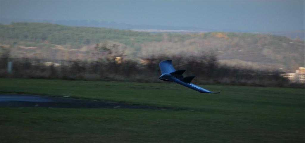 Tak jsem dnes poprvé letěl s tímto samokřídlem. Dostalo se ke mě od kamaráda, kterému zle posekalo prst na ruce při startu. Změnil jsem mu "kabátek" a upravil mu pohon na 4S 4000mAh. Letovou hmotnost mám 1210 gramů. Neuvažuji o instalaci FPV, i když je na to model navržen. Překvapilo mě, jak velkou silou ho musím mrsknout do vzduchu abych získal čas na chycení kniplu a puštění motoru