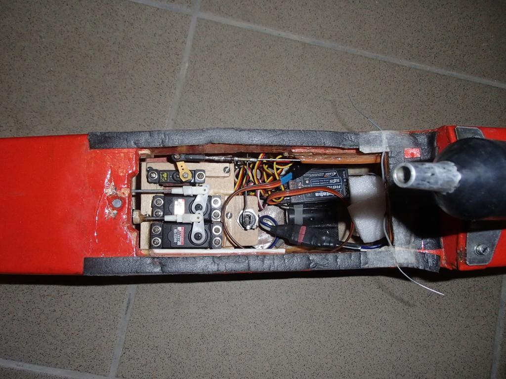 Tady je pohled na instalaci ve vnitřku trupu. To další servo pro směrovku zabralo dost místa a tak jsem byl nucen pro RC karburátor použít mikro servo (Dymon)