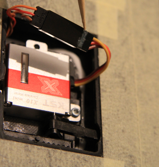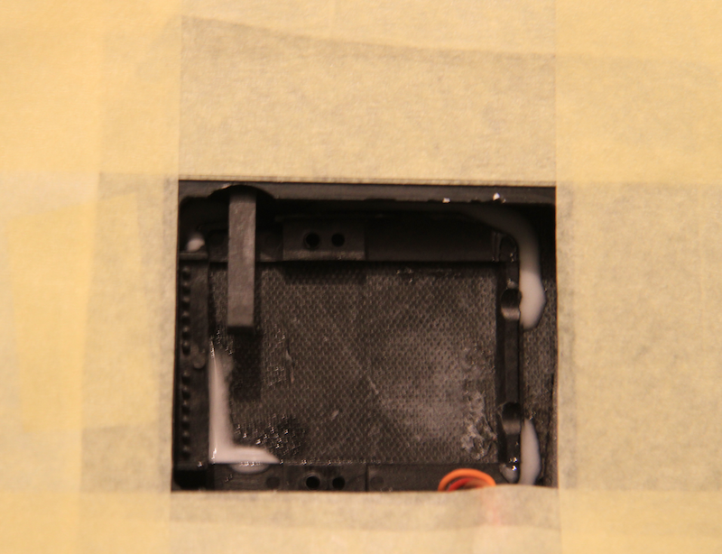 Zlepeny ramecek kridelka, vcetne serva. Servo je zatim ve folii (ktera zabrani prilepeni serva k potahu)