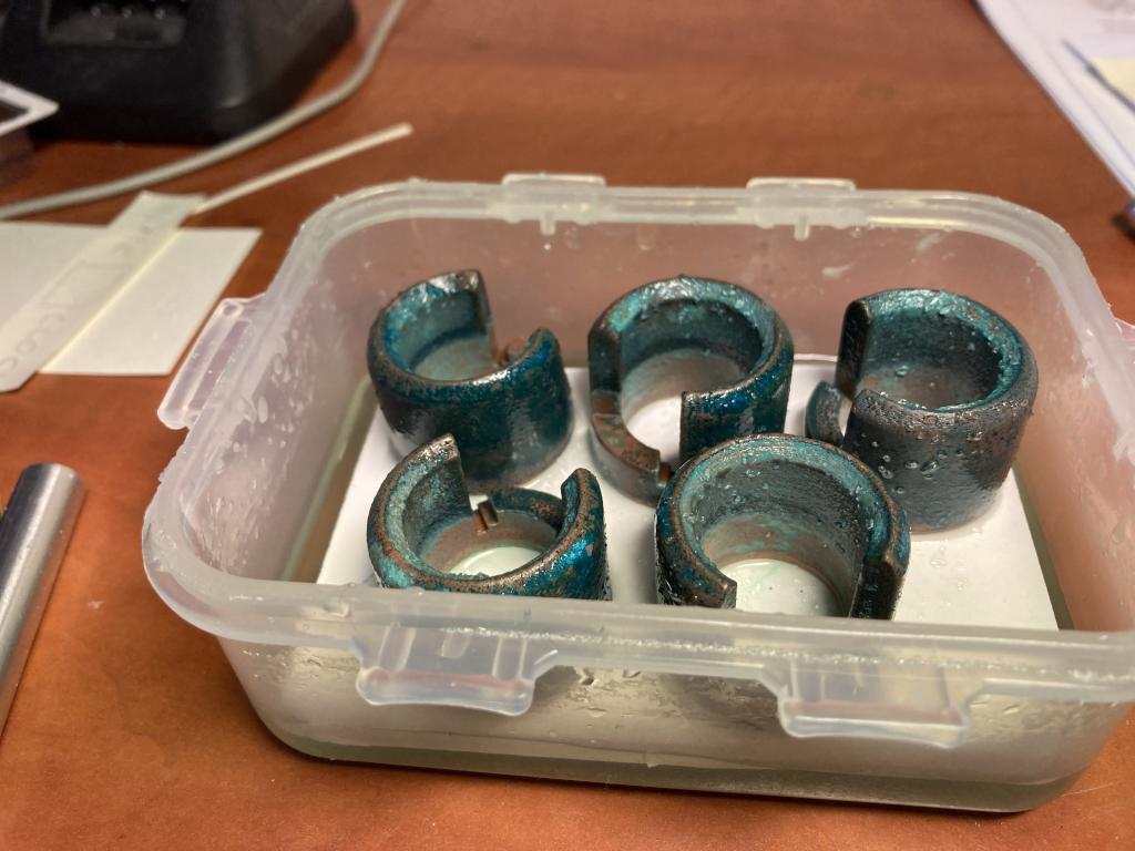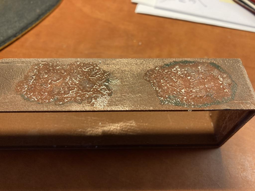 Nechám to zaschnout, pak lehce přebrousím aby měděnka byla tak na 50% ovrchu. Ještě mořím krabičku (toto jsou k ní nohy, pět je jich že nejhorší vyhodím).