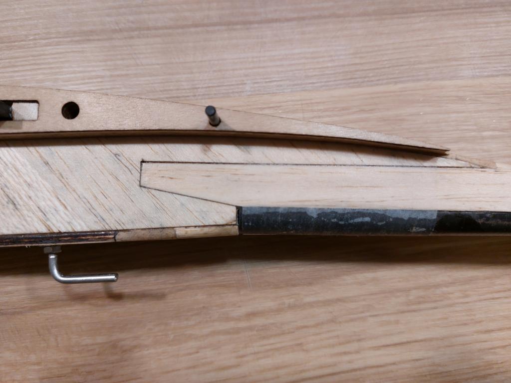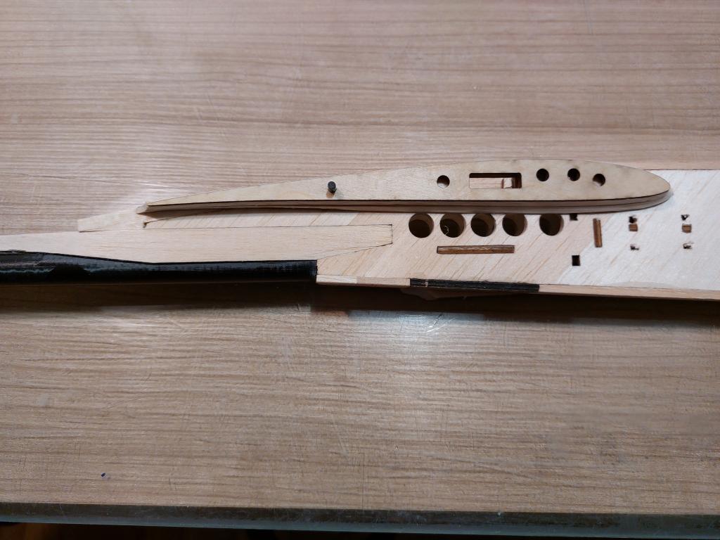 Zjistil jsem, že na plánku chybí zesílení z vliesu kolem trubky, které by mělo zabránit štípnutí bloku balzy ve kterém je trubka zalepená. Viz foto. Dále, pokud někdo bude chtít do modelu přidávat balast, tak je možnost si propilovat v bočnicích díry 10mm, které jsou vypálené v překližce 1mm pod bočnicemi. Na fotce ještě z testovacího kusu