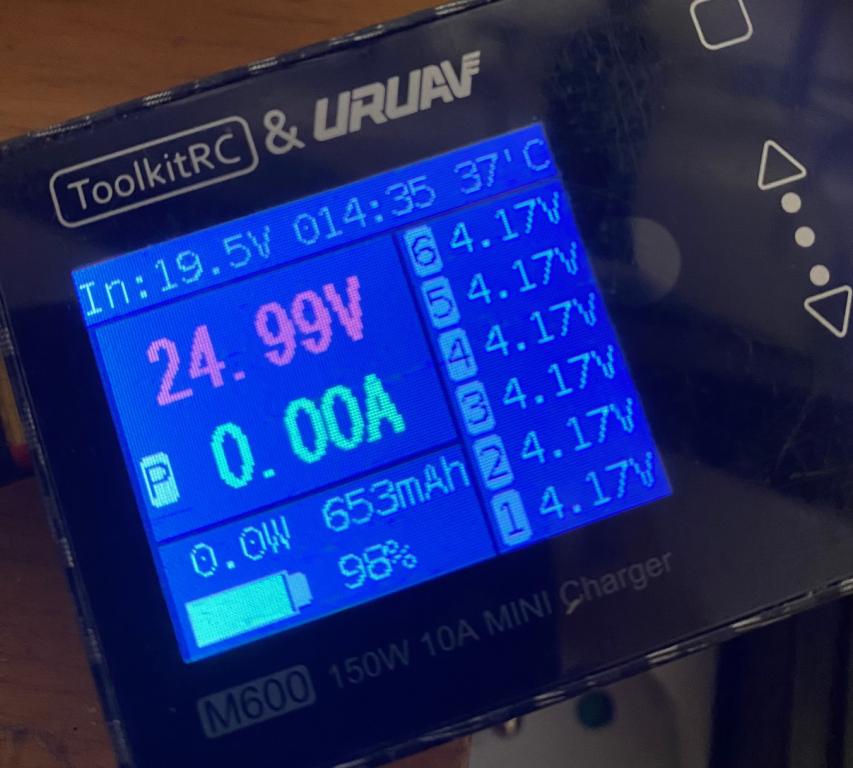 Dnes krátký test: 5 minut visení - cca 2 - 3 metry výšky při RPM 1400 - dobíjeno 650 mAh - tj. odběr kolem 7,8 A (vzlet s 25V a přistání 24V - 6S 3Ah Lipo)
