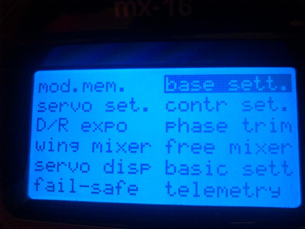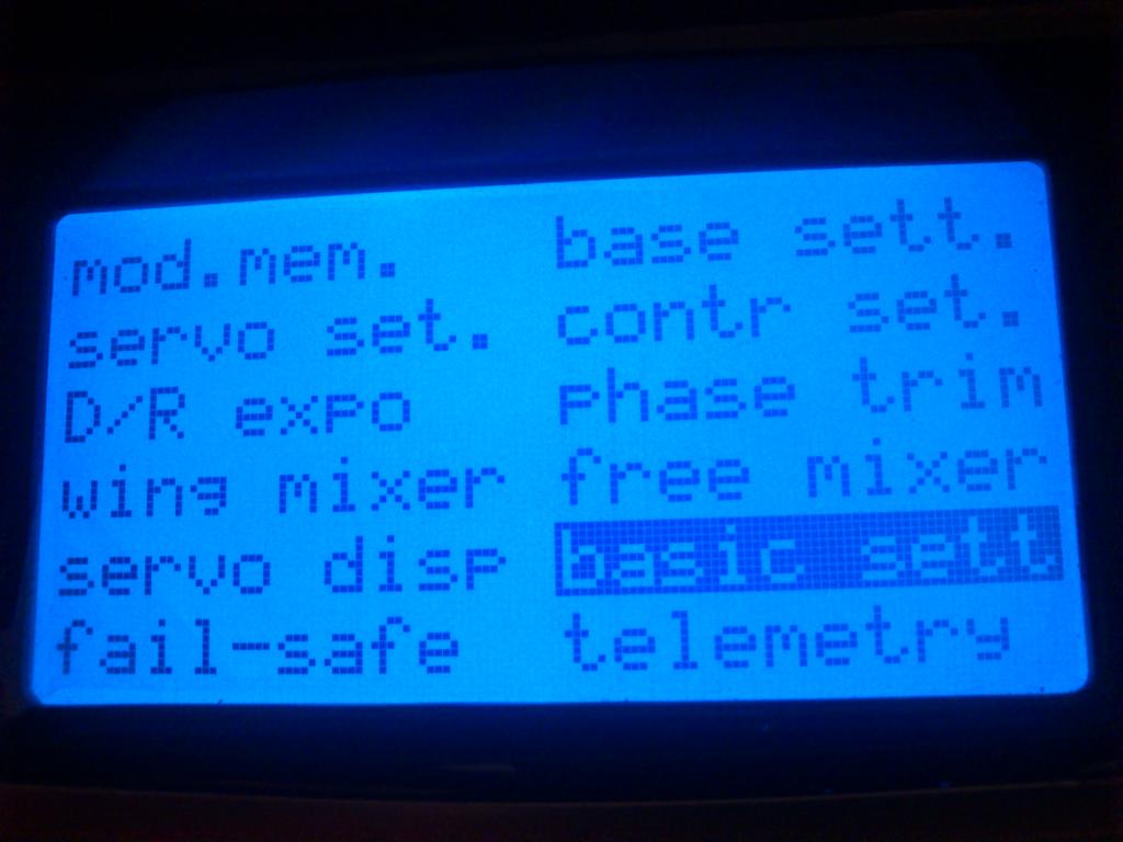 Podle mě se motáš někde v telemetrii. Měl by jsi být v základním menu modelu - tam kde se přiřazuje jméno modelu, předprogramované mixy a pod. Měla by to být první položka ve druhém sloupci.