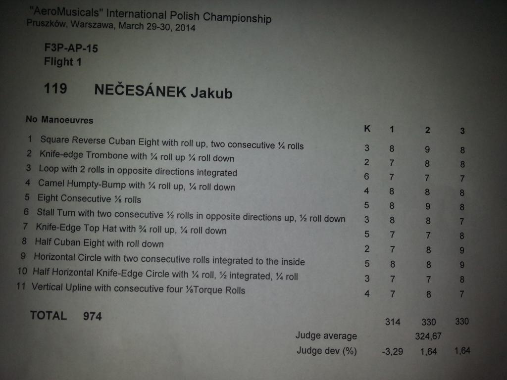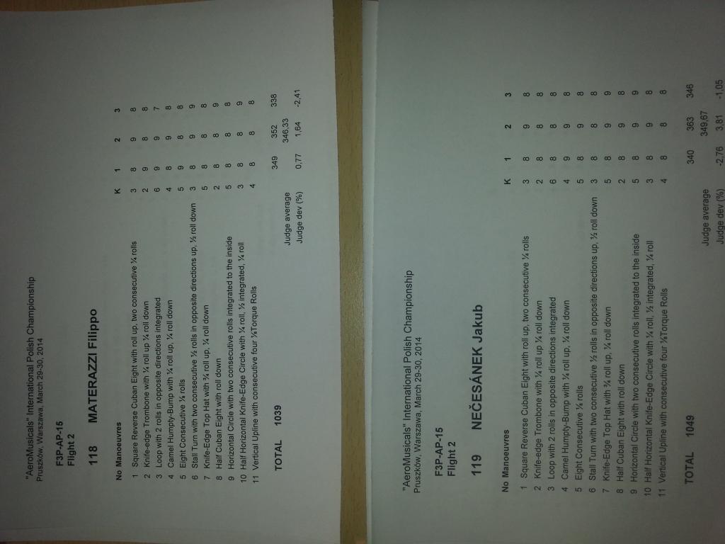 Už máme po prvním kole AP, Gernot doplatil na špatný kontakt v přijímači a nedoletěl ani půl sestavy než se mu letadlo neovladatelně sneslo k zemi. Donatas se zaslouženými body vyhrál, a za nímse umístil s lehce nezaslouženými body Filippo Materazzi.