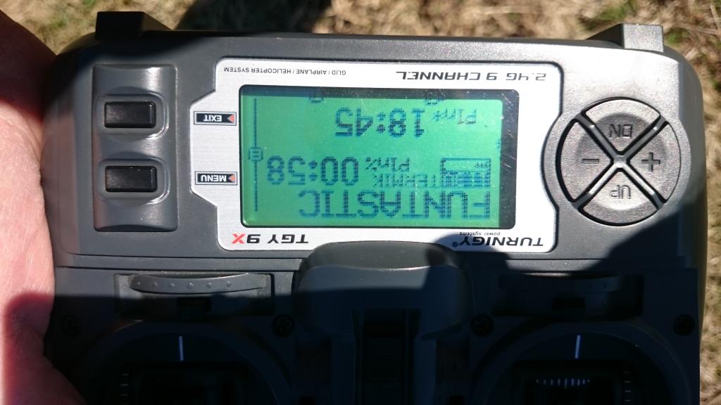 Vždycky jsem jí nakonec ztratil a musel na motor přistoupat abych to zase mohl zkusit, ale byl jsem šťastnej jak malej kluk! Na 10 minut plnýho plynu (Pln%) jsem byl ve vzduchu naráz 60 minut - což se mi ještě nikdy nepovedlo a jsem naprosto nadšenej. Baterie BH Power 2600mAh 35C a z toho bylo ještě tak 5 minut letu na všelijaký kejkle ve vzduchu. Pak jsem dal novou baterii jen tak na rychlý blbnutí ve vzduchu, už jsem měl málo času - a chytlo se to v termice ještě lépe - řekl bych, že teď odpoledne je to ještě lepší. S druhou baterií na 1 minutu plného plynu skoro 19 minut v termice! Musel jsem si to vyfotit... No Funtastic je funtastický letadlo!