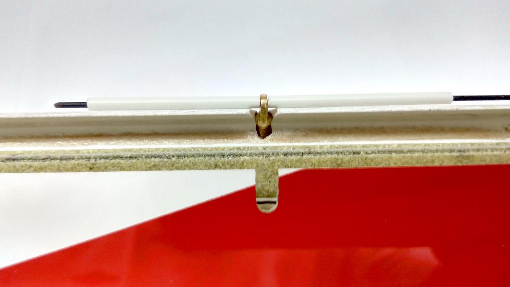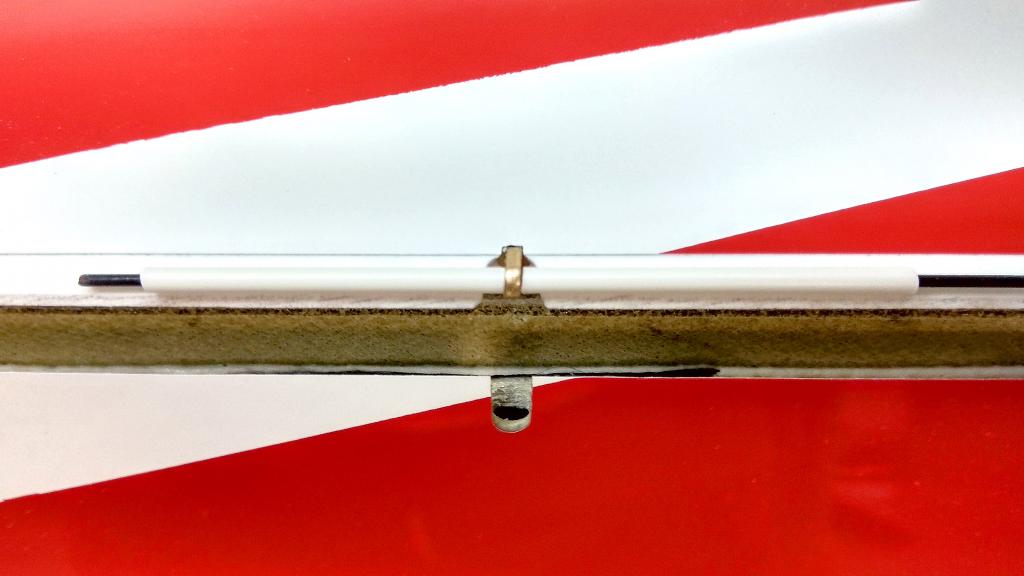 A teď nějaké info pro někoho, kdo by to chtěl dělat taky. Páky serv mají rameno přesně 7 mm. Mým postupem zalepená páka křidélka má rameno 8,5 mm, je předsunutá asi 1,5 mm. Výchylky jsou pro standardních +/-100 % rozsahu vysílače (odpovídá +/-40 stupňů, jde ale zvýšit až na +/-60 stupňů) na konci křidélka 17 mm nahoru a 14 mm dolů. Chci to mít o dost agresivnější, než je běžné, takže určitě použiju větší než doporučený rozsah výchylek, větších výchylek bezpečně a s rezervou dosáhnu. Je možné i více brzdit křidélkem nahoru a stále zbyde dostatek pohybu na případné korekce klopením. Zářez do křidélka jsem musel prodloužit, aby nic nekolidovalo. Jak jsem dříve psal, páka serva samozřejmě tady směřuje k vrchnímu profilu, táhlo je ohnutá struna o průměru 1,5 mm a musí obcházet motor serva, na fotce je to vidět. Výsledek na ty peripetie dobrý, teď ještě nějaká ta estetika …