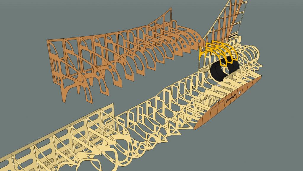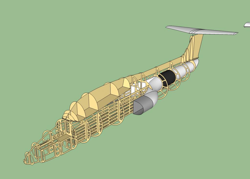 budu to potahovat 1mm balsou, přepážky jsou 50 mm od sebe a tím dobře definují tvar. Je to hodně prořezaný, snad to nebude moc těžký. Zabralo to cca 100 hodin :(