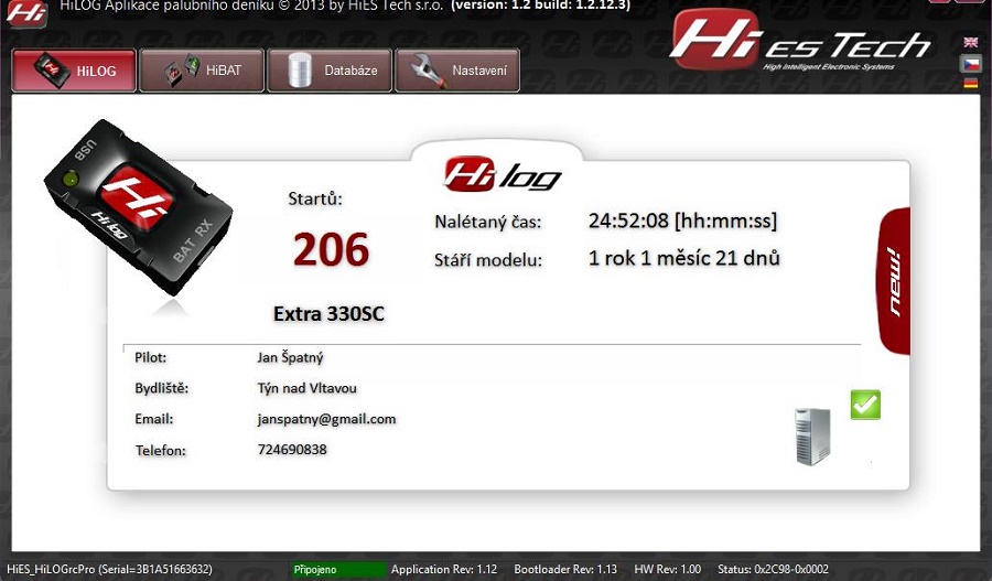 HonzaS píše:Myslím, že s klasickými "R" přijímači to nešlo, u CentralBoxů to ale možný je. Já navíc používám Hiestech Hilog, ten řeší všechno (počítá starty, nalítaný čas, cykly na baterkách) sám a nezávisle. Takhle pak vypadá screen úvodní obrazovky, ještě je možný si projít let po letu (včetně datumu, času, délky letu, přetížení ve třech osách, ...)