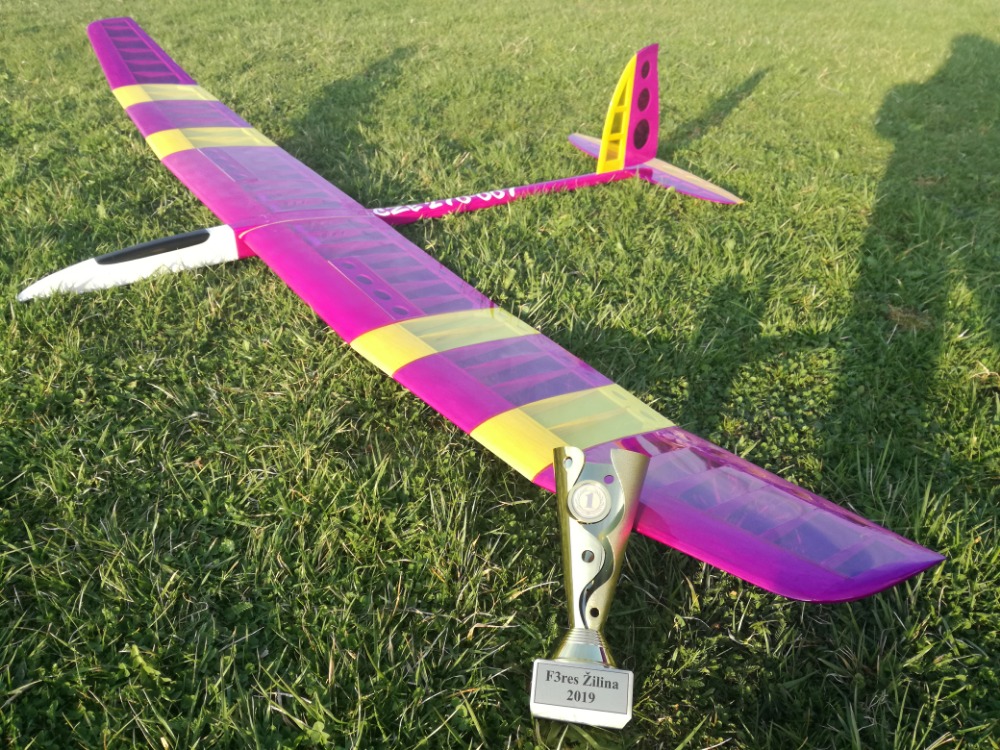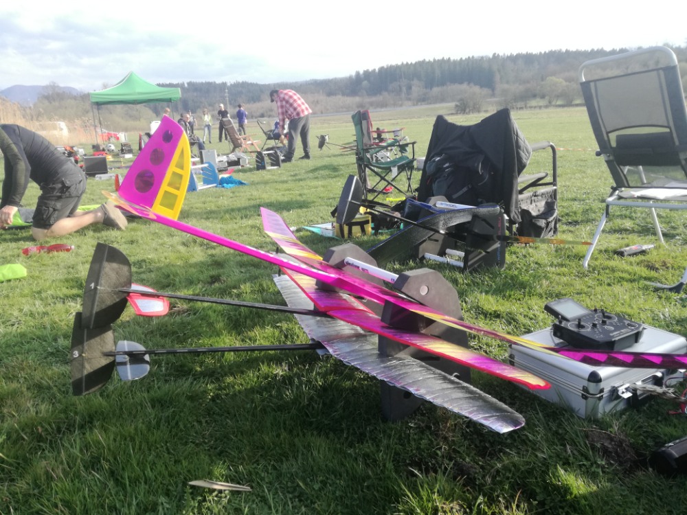 Já jsem se dostal kvůli všem restům a víkendovým návštěvám k záletu KIWIka až v sobotu v 19:00. Pár klouznutí z ruky pro ověření těžiště, několik postupných dovážení a dva starty na tvrdém RCVS gumicuku a byla zase tma. Kiwi je tedy opravdu noční pták. Další krátký test proběhl až ráno na Slovensku, opět malé doladění úhlu seřízení, 3 starty na gumě a hrubé nastavení mixu spoiler + VOP a už pořadatel hlásil přípravu první skupiny ve které jsem měl hned letět. Vítr byl celý den slabý variábl, občas silnější termický závan ze všech možných stran. Výšky nebyly tedy nic moc, guma je sice mnohem lepší než u RCVS gumicuků, ale v bezvětří odhaduju tak max 80m možná když se někomu podařilo trefit vzduch tak 100m, ovšem se závanem do zad i o dost méně. Lítání to bylo velmi poučné, vykroužit pokaždé z 40-50m s „dvoukanálem“ bez klapek a křidélek není úplně jednoduché, opakovalo se docela často. Já jsem opakoval jednou a to v druhém kole, když za zády po větru odcházela nejsilnější termika dne. Neváhal jsem opustit rozhádanou nulku nad stromy a odstartovat znovu na jistotu po větru dozadu. Výška po 4minutě letu byla cca 300m. Naopak poslední 6. kolo bylo opravdu těžké, letělo se už pozdě odpoledne, výška po startu nic moc odhadem 50m, takže přesun na vzdálený osluněný svah a plácání se v nulce a čekání zda zesílí. Nakonec i ona potvora zesílila! Letový čas se mi nakonec podařilo nalítat vždy s rezervou a tak jsem si mohli vždy s radičem užívat hvízdání folie při návratu dolů. Na přistání to chce ještě doladit křivku mixu a hlavně si na model zvyknout. Dohromady 15 startů z toho 6 soutěžních je fakt málo. Plných 100b za přistání se mi podařilo jen jednou, jinak asi vždy do metru.