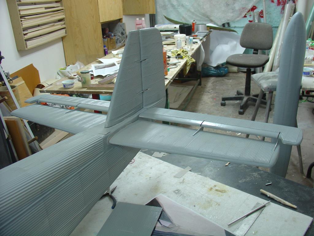 Dneska jsem ocasní plochy dokončil, už jen propojit se servama. Je s tím pěkné sra..í. Zítra už jen dotmelit přechody a vzpěry a hotovo, mohu stříkat. Kompletní trup hmotnost 2,5kg :D