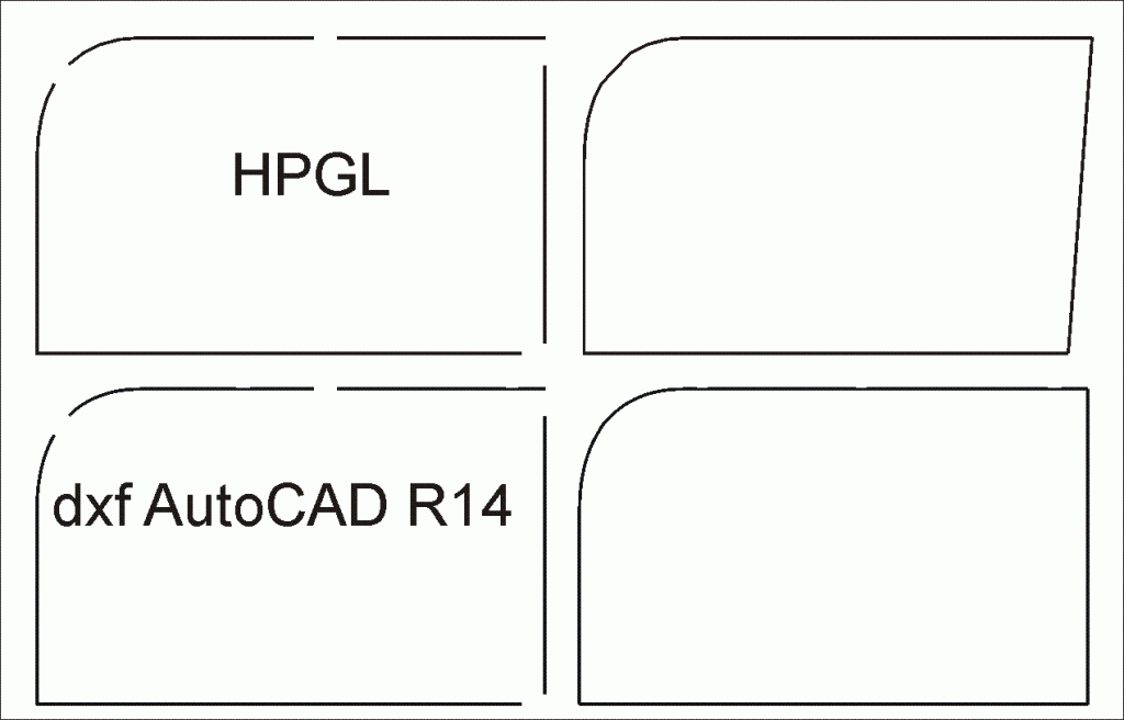 Trochu jsem otesal obdélník, v rozích mezery 0,9mm - v pravém horním užráno jen z jedné úsečky, vpravo dole z obou, horní úsečka mezera 0,9mm, levý horní roh rádius a ten přerušen cca 0,9mm mezerou. To jsem vyexportoval do HPGL (jak mám zaužíváno) a do dxf verze ACAD R14.