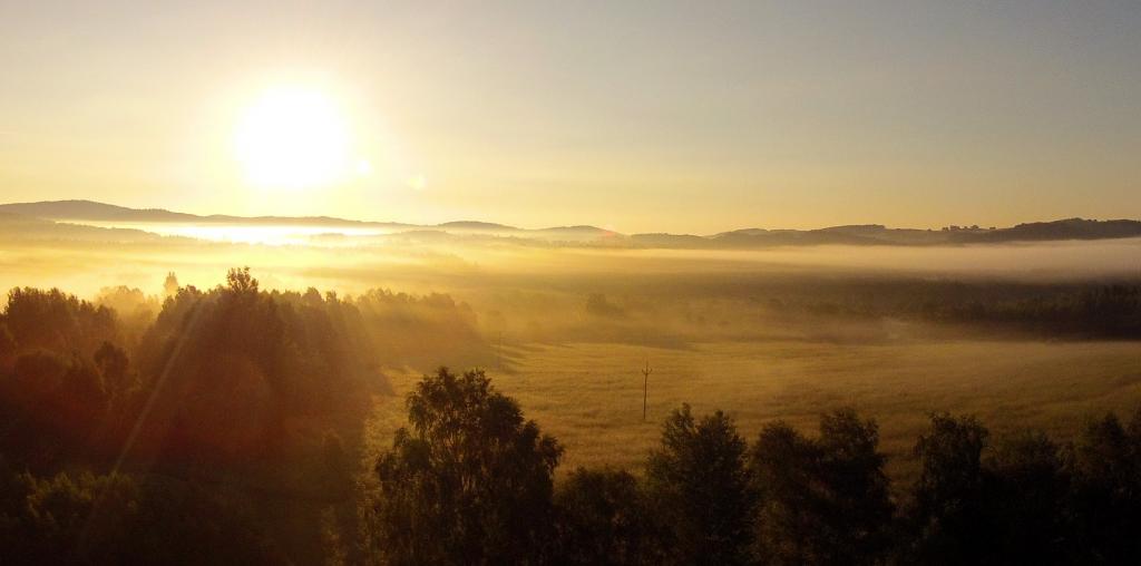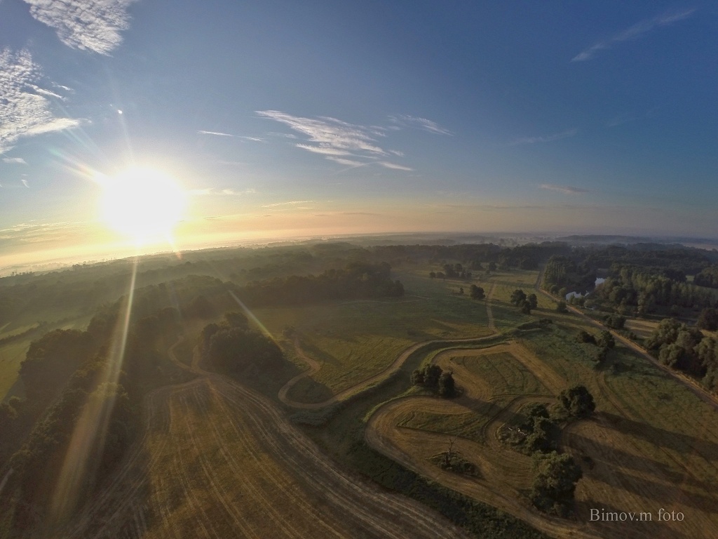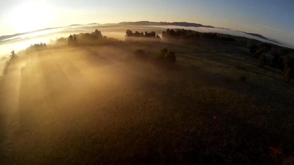Budíček 4:15 hod kouknu ze stanu a úžasná dvouvrstvá mlha neváhal jsem a rychle jsem provedl předletovou .... zapnu kameru a hodím cca 5 minut letu, přistanu kontrola kamery a ooovej baterka klekla to je na ... ! Bohužel o to nejlepší jsem přišel pak do toho začalo svítit slunce a bylo to pryč. Dal jsem ještě jeden let ale nebylo to ono . Na jedné s fotek je i čáp. Dalo by se říci že byl jak přilepený ani se nehnul když jsem prolétal o kolo.
