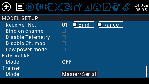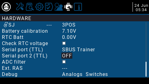 Takže v případě TX16S v obrazovce hardware serial port (TTL) zapnout na sbus trainer a v obrazovce MODEL SETUP trainer moce Master/serial