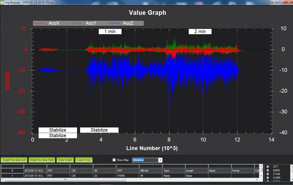 Ucim se to krok za kroke. Ted se mi podarilo konecne pouzit nejaky ten graf z logu. Napadlo me, jestli to nemuzou ovlivnovat vibrace. Tady je graf z kratkeho letu ve STAB. Myslim, ze jsou vibrace trochu vetsi, nez by mely. Deska je ale izolovana skoro perfektne. Co myslite?