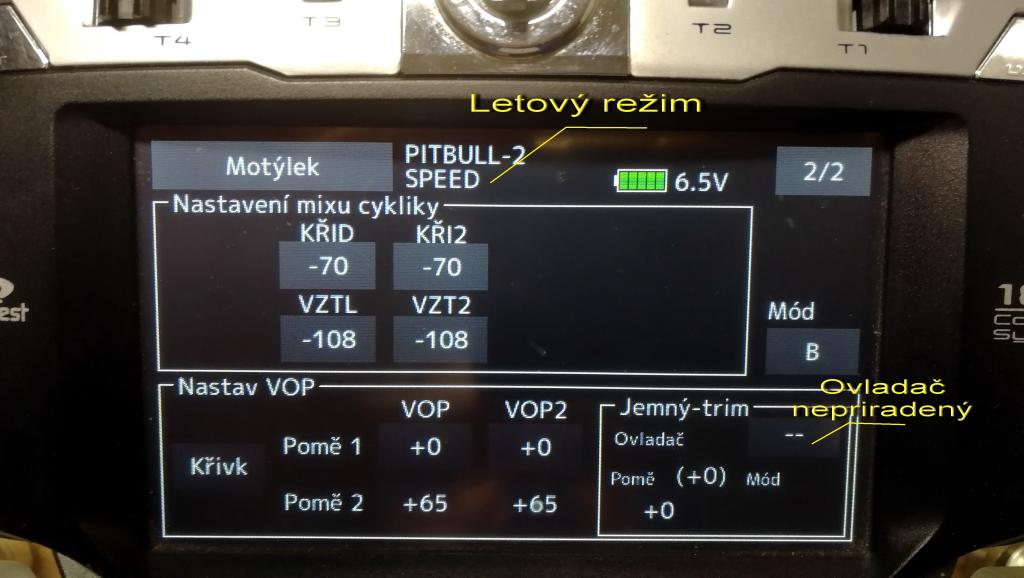 Ahoj, screenshoty bych moc uvítal, moc děkuji! Na třípolohovém přepínači bych rád měl módy "Vypnuto" - "Normální" - a na třetí poloze dle výběru. A mžikovým tlačítkem bych chtěl přebít všechny tři možnosti a dát tam záchranný mód myslím "Horizont" (ještě je nově 2D, ale nevím, který je lepší), který by letadlo srovnal co nejrychleji do stabilního letu. Chtěl bych mít možnost i při vypnuté stabilizaci možnost letadlo zachránit.