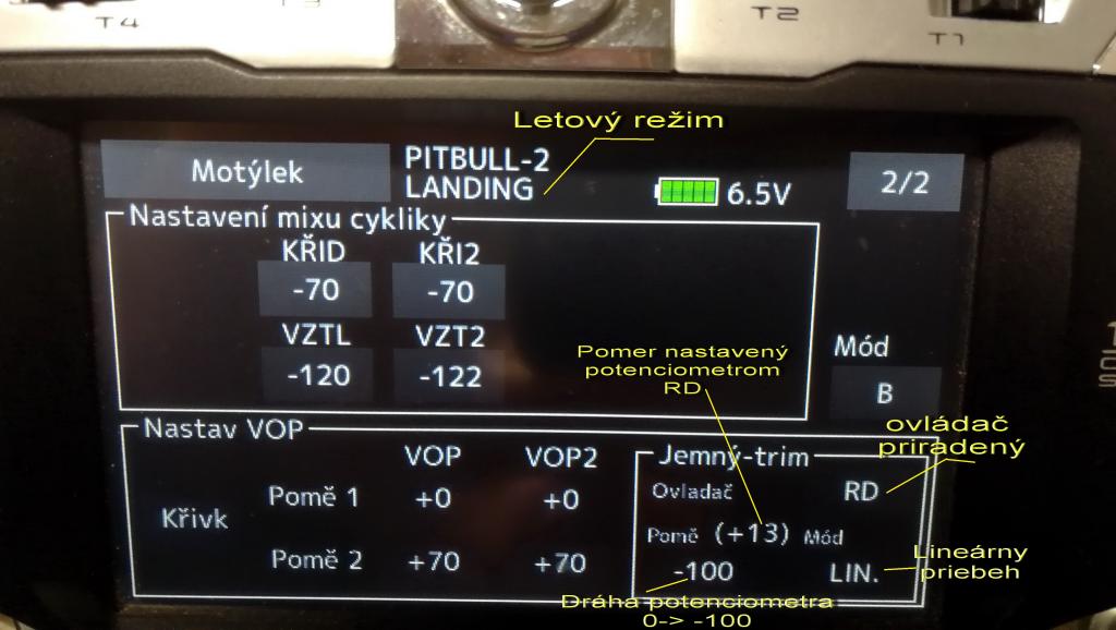 Já jen že jsem něco podobného našel u Jeti jen u motýla. Snad se zapojí někdo, kdo zná Jeti lépe.LV píše:Ale to je presne ono. TRIM MIXOM menim velkost (priebeh) funkcie "Slave", v tomto pripade VOP. A mam k dispozici 3 moznosti co potenciometer robi. Priebeh - 100, 0, +100 alebo 0, - 100, alebo 0 +100. 0 je stred a - 100, +100 koncove polohy.