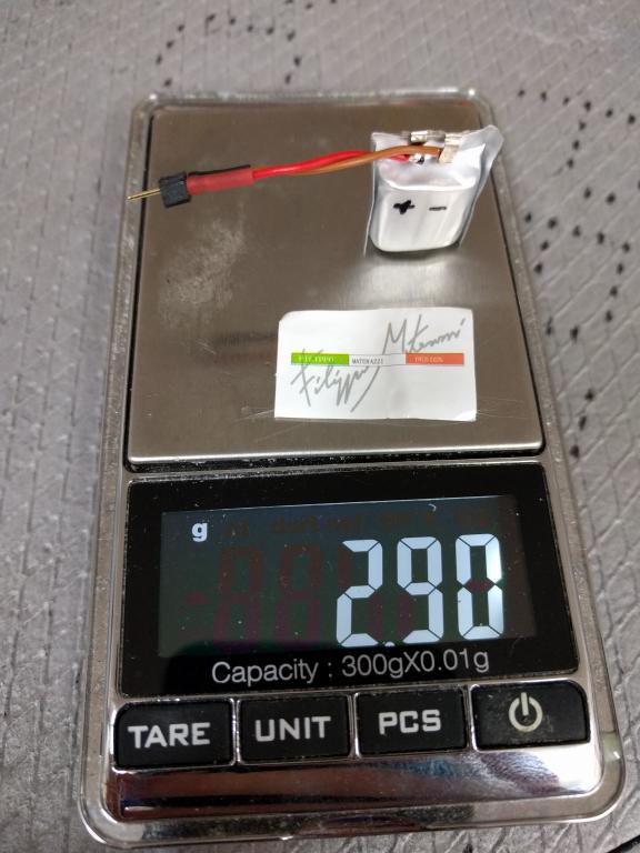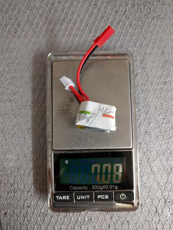 Mezitim mam zvazene 100mAh 1s - 2,9g a slo by jit i niz. Kablik s konektorem ma 0,35g. Tak snad to na ne sestavu odleti. Baterky, se kteryma jsem soutezil do ted mely 7,6g a 1s SLS 120 ma 4g. A taky by sly nepatrne odlehcit.