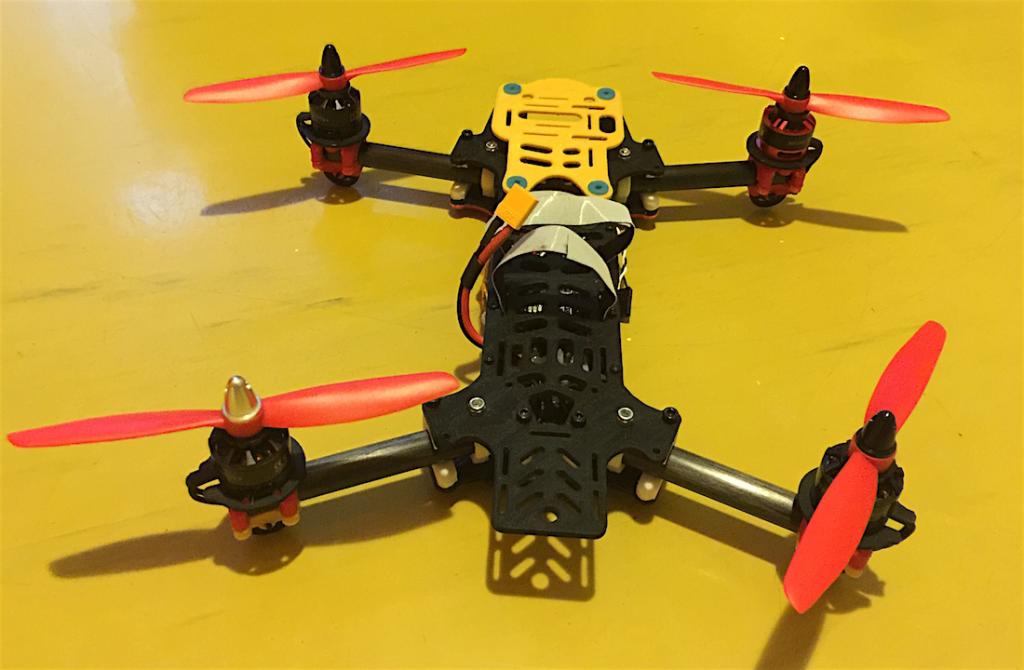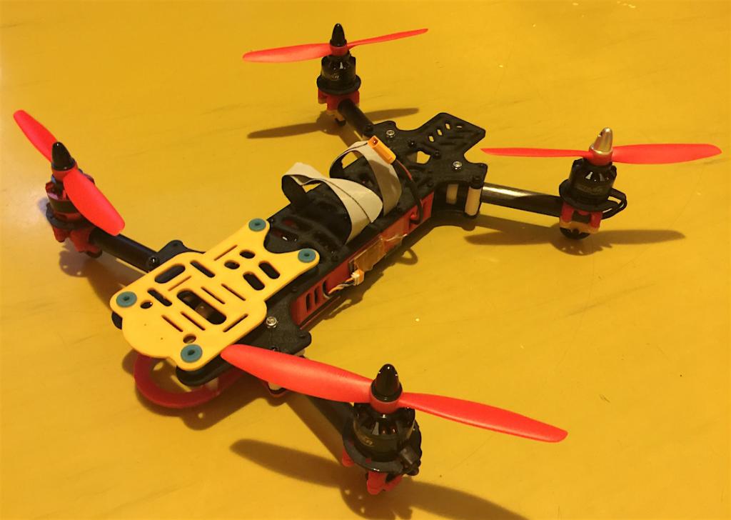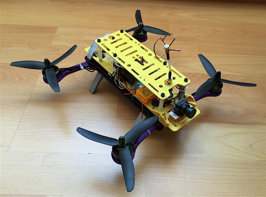 Je to drobně modifikovaný MHQ2, viz http://www.thingiverse.com/thing:511668 , řídící deska zatím CC3D, ale na cestě je "nová generace" Revolution, se kterou počítám jako cílovým řešením (v tomto případě je prostě držení pozice a podobné věci žádoucí). Letově podle očekávání bez potíží (zatím bez Gopro). Jinak osazení je ve variantě s "clean plate", kdy jsou plata s kamerou a jednotkou od motorů kompletně odtlumeny. Model se dá udělat i v "závodní verzi", pak jedno plato a silentbloky odpadnou, to ale testovat nebudu, na blbnutí mám jiné modely.