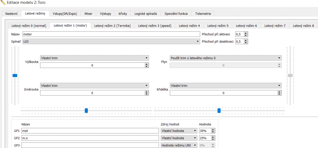 v menu rádia v letovom režime zmeníme nastavenie trimu T5 a T6 na hodnotu --- v letovom režime 0...