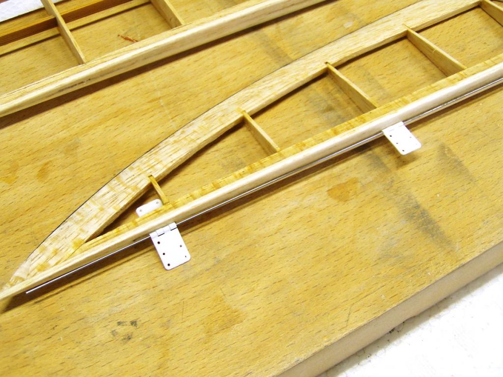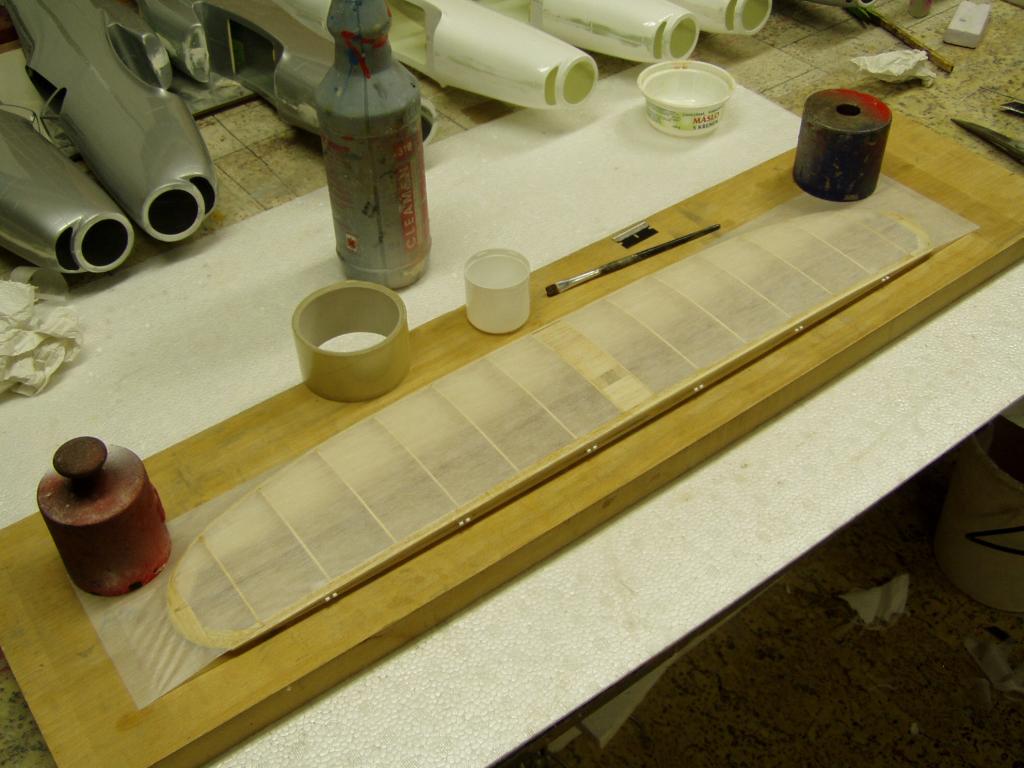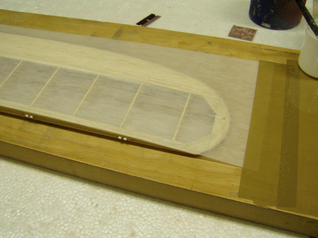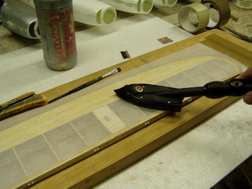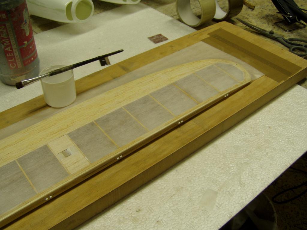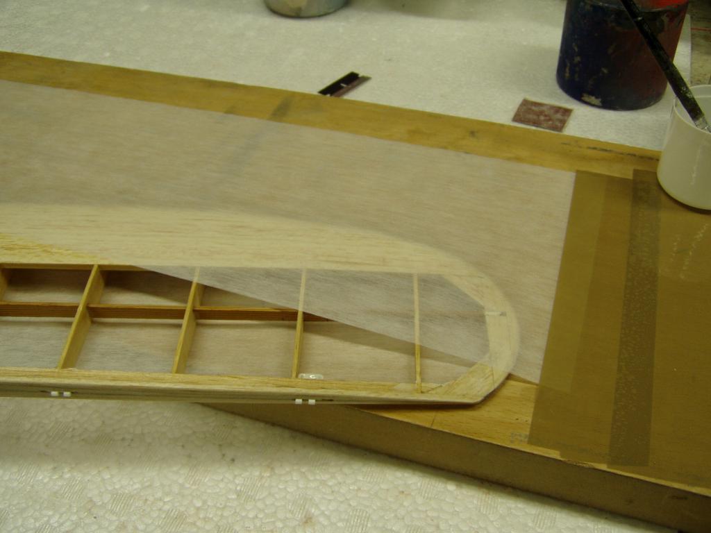 Vedom si odporu Vliesu k ohybani, pouzil jsem lest a odtokovou hranu stabilizatoru potahl tenkym Modelspanem.