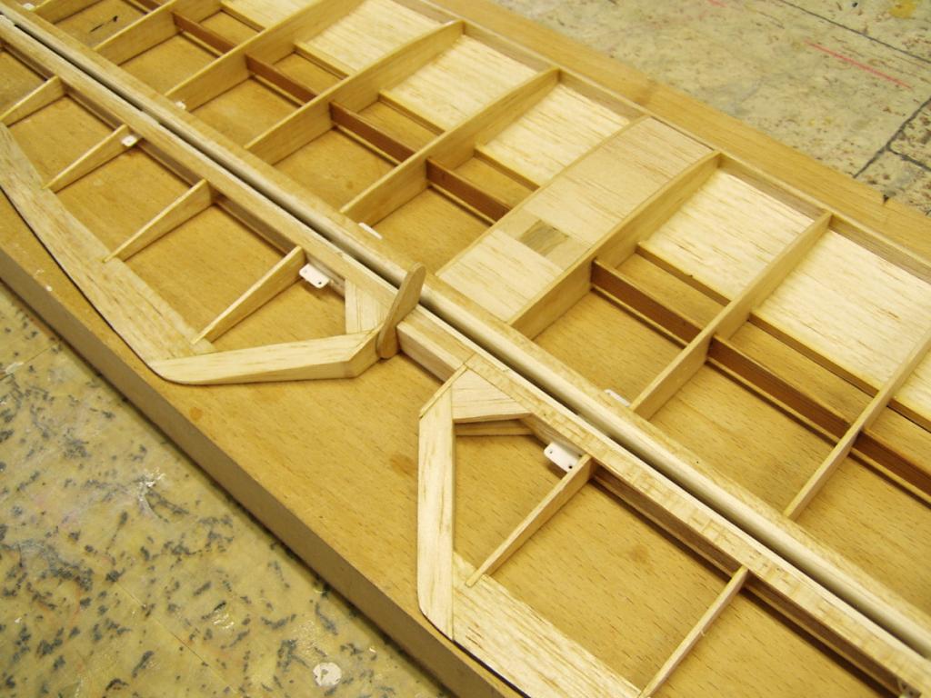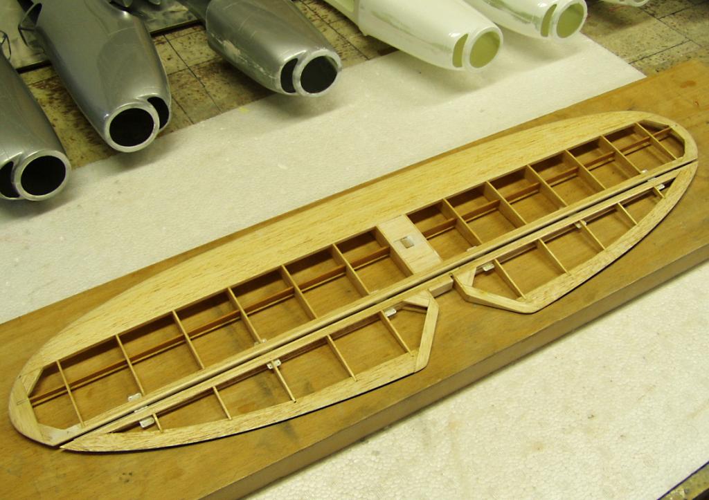 Stabilizator bude k trupu upevnen (spolecne se s kylovou plochou) jednim ocelovym inbusovym sroubem M3 a dvema koliky v nabezne hrane. Proto jsem k hlavnimu nosniku ze zadni strany prilepil bukovy hranolek cca 10 x10mm, ktery plni funkci distancniho sloupku a prenasi zatizeni do konstrukce.