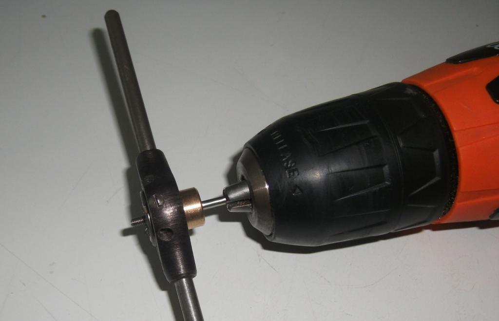 Pro snazší řezání závitů M2,5 na antikorový drát jsem si nechal vytočit vodicí pouzdro, je to myslím velice šikovná věcička, závit je pěkně rovnoměrný, nesjíždí ke straně. K pevnému držení drátu jsem využil sklíčidlo vrtačky, je to lepší než drát mordovat ve svěráku. Závit řežu ručně, použít pohon vrtačky by bylo brutus, tím jen vytáčím hotové táhlo...