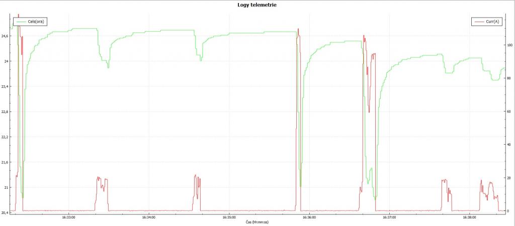 Z grafů se dá vyčíst na více místech v 200metrů dlouhém úseku stoupání 35m/s. V kratších úsecích atakuje i 40m/s. Takže spokojenost i s tímto. Jen jsem na vysílači špatně nastavil logování a tak nemám hodnoty napětí a proudu, logoval se pouze příkon a ten při plném plynu byl 2,5-2,8kW.