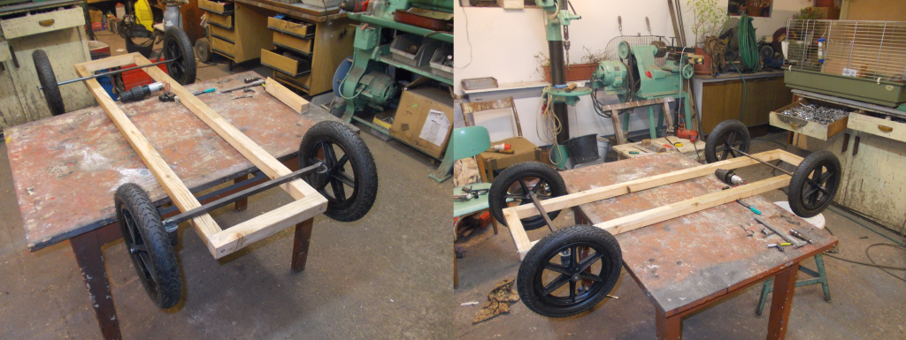 Dnes odpoledne jsem začal. Sehnal jsem 4x nová kola,skoro nejetou akučku na 18V (mohl jsem mít i na 12V ale řekl jsem si že bude lepší rezerva. Spíchnul jsem dřevěnej rám a hlavně jsem vyřešil přední řízení do čehož se mi moc nechtělo. Tak jsem rád že otočné čepy mám za sebou a dokonce na ložiskách.