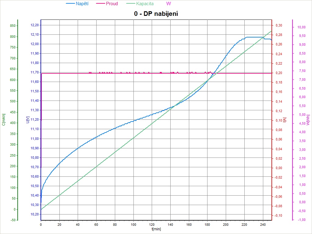 Inak čas 240min, to sú 4 hodiny, píše to 800mAh to sedí, ale to teda nie je 1/10C ale 1/4 a tam je síce DP podľa mňa tiež nie celkom zaručený ale určite jasnejší než pri 1/10C ( =80mA, nie 200).
