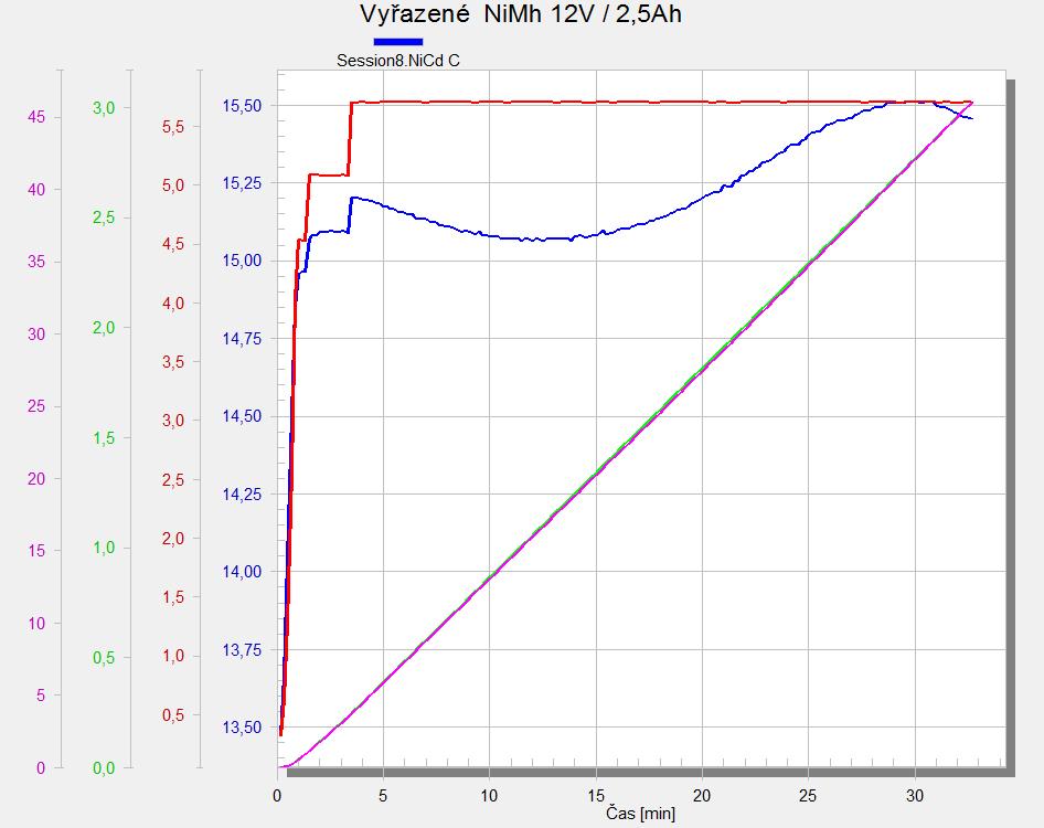 Eneloop 8čl stáří cca 12-14 let a nabíjení 0,1C (200mA) s ukončením Dp. Teplota při ukončení 35°C při okolní teplotě 27°C.
