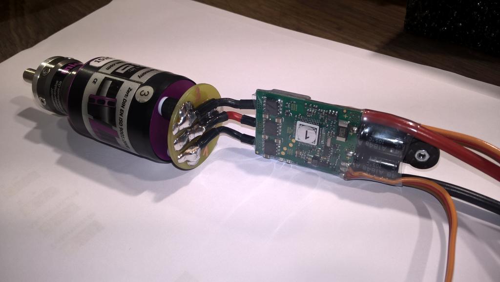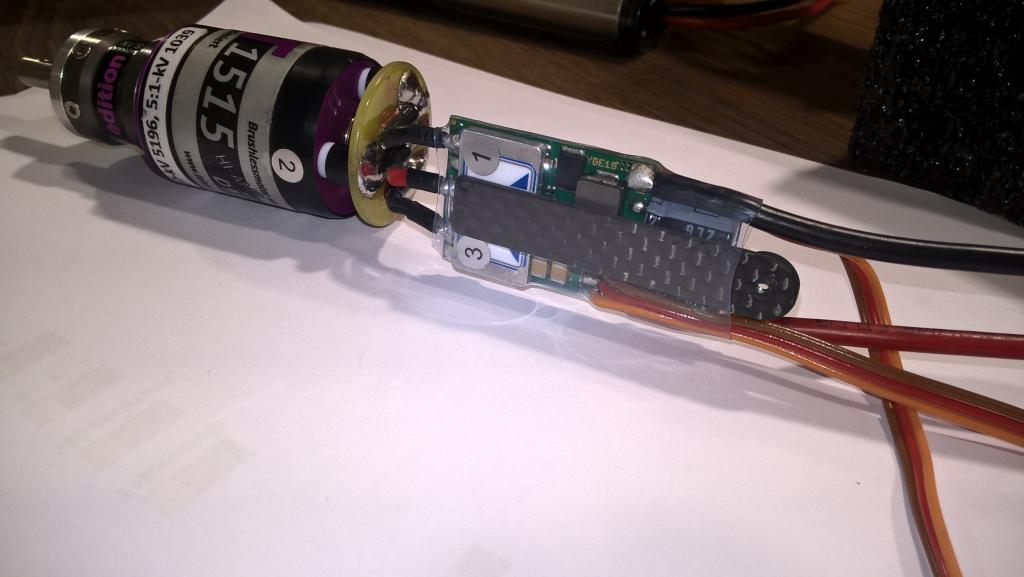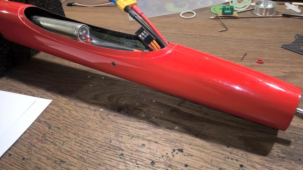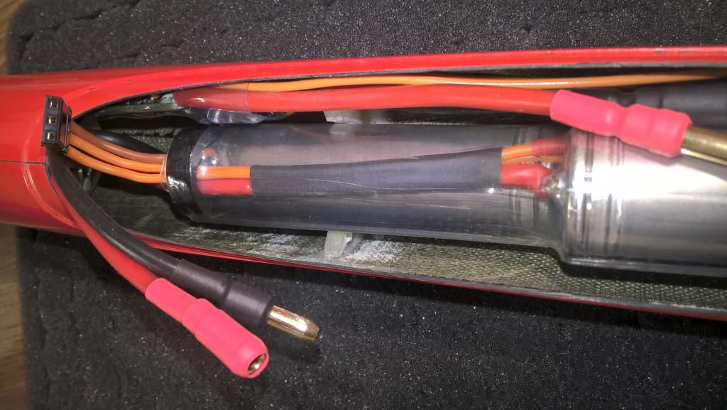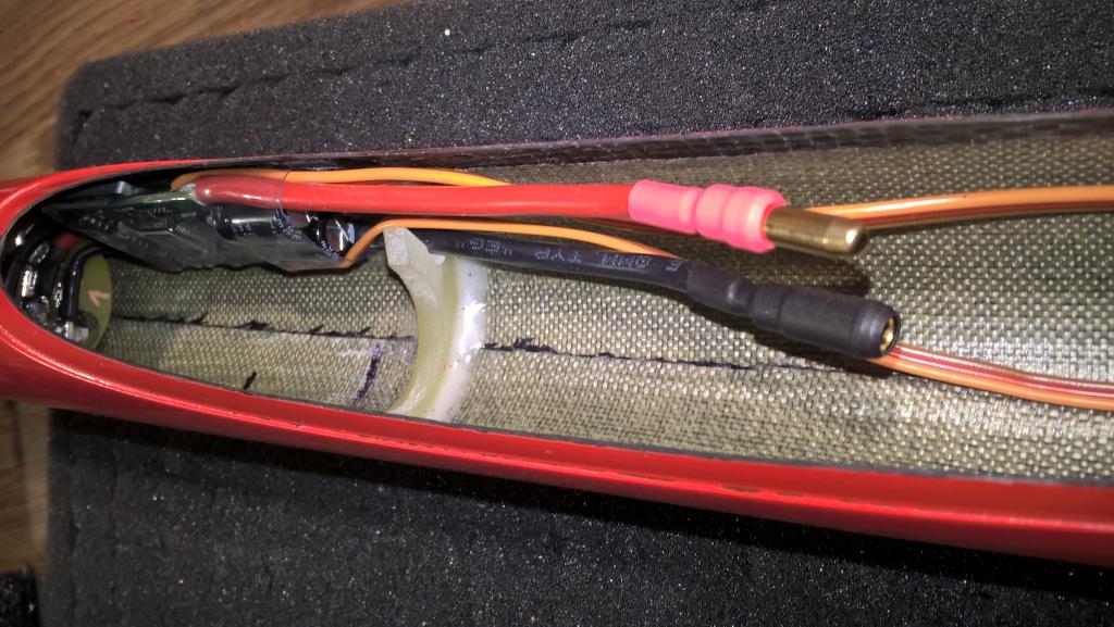 Na fotkách je spojení motoru a regulátoru. Regulátoru jsem vyměnil výstupní vodiče a pod smršťovačkou je držák reglu z uhlíkové desky. Regulátor je pak přišroubovaný zápustným šroubkem M2. Navíc je v trupu zalepená púlkruhová přepážka, která nejenom ještě navíc vede vodič reglu, ale i do ní poté zapadne baterie 3S-LiIon 2600A.