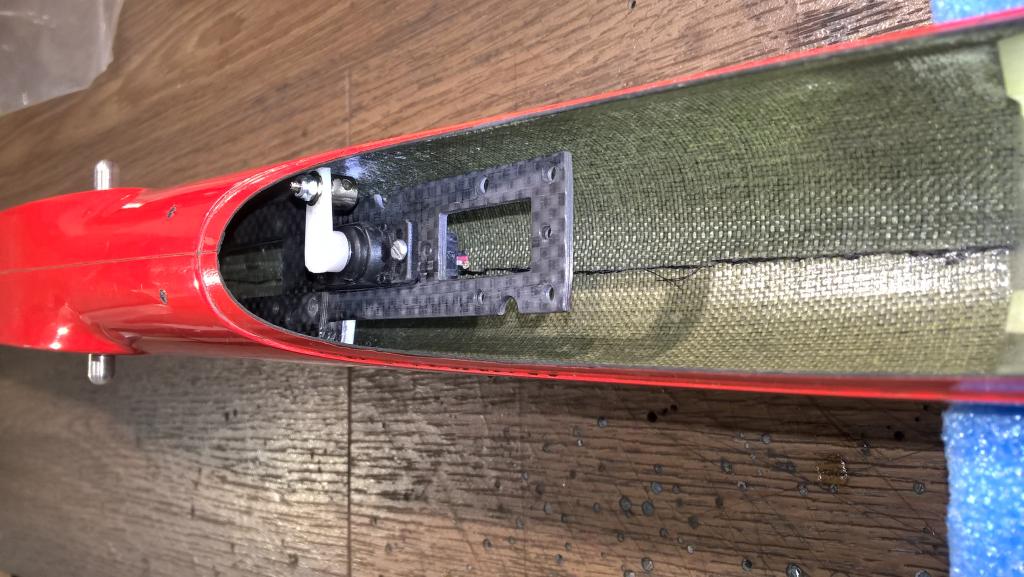 Vše je vlepené do trupu a poté bude ještě přelaminované skelnou tkaninou. Pro odměřování používám stará zničená serva. Proto tam je jen jedno bez kablíku