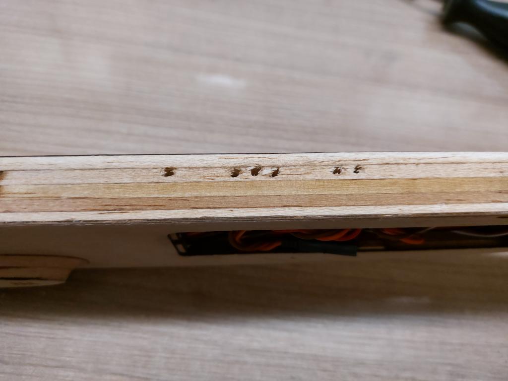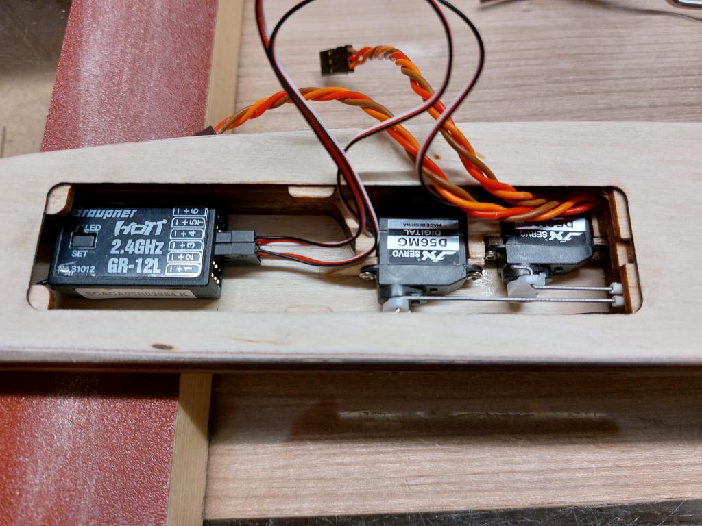 Model je osazen servy JX PDI-D56MG. V minulém modelu jsem měl GO-6MG, která se zdají být s JX identická. Jako baterii používám 4x Ni-Mh 350mA. Na fotce je ještě hlavice z první série, kde bylo nutné serva vypodložit, nové hlavice už tuto úpravu nepotřebují. Pro montáž serv je potřeba si vyvrtat montážní otvory, které se po montáži zaslepí odřezkem balzy. Letová váha je nyní 435 gramů s folií Oralight, což je o 5 gramů méně než model se kterým jsem létal v loňském roce.