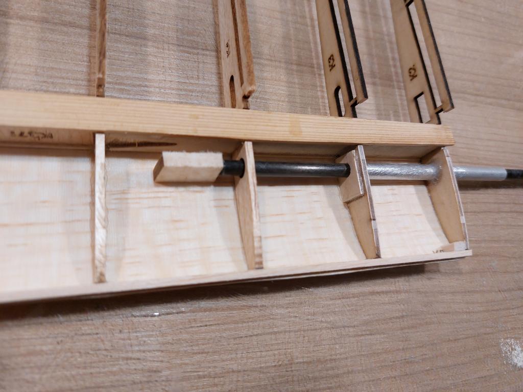 Když jsem nyní stavěl nová křídla, nechtěl jsem je zajišťovat k trupu magnety. Místo toho jsem zkrátil přední trubičku jen k žebru K3 a na žebro nalepil překližku 1mm. Ta má vybroušenou díru, která na spojce "táhne". Je to vidět z obrázku... Myslím, že na dalších křídlech, která půjdou z výroby přední trubičku úplně vypustíme.