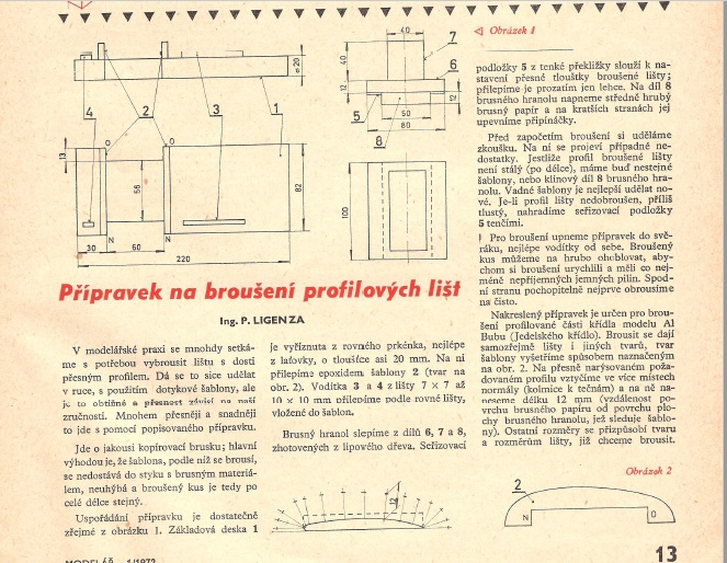 Když už jste se zde bavili o Jedelského profilu, tak si vzpomínám , že můj klubový kolega ing Pavel Ligenza vymyslel a s úspěchem používal přípravek na broušení přední profilované lišty pro stavbu modelů kategorie A1 ( i já jsem pomocí od něj vypůjčeného přípravku jednu A1 s Jedelského profilem postavil ). Přípravek publikoval v časopise Modelář 1/1972 na straně 13. Stavebnici modelu Susi vyráběla firma Wik modelle https://outerzone.co.uk/plan_details.asp?ID=11663
