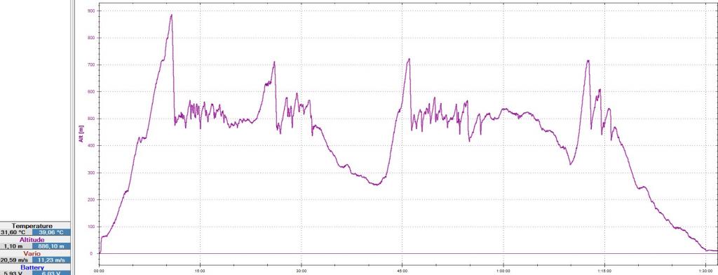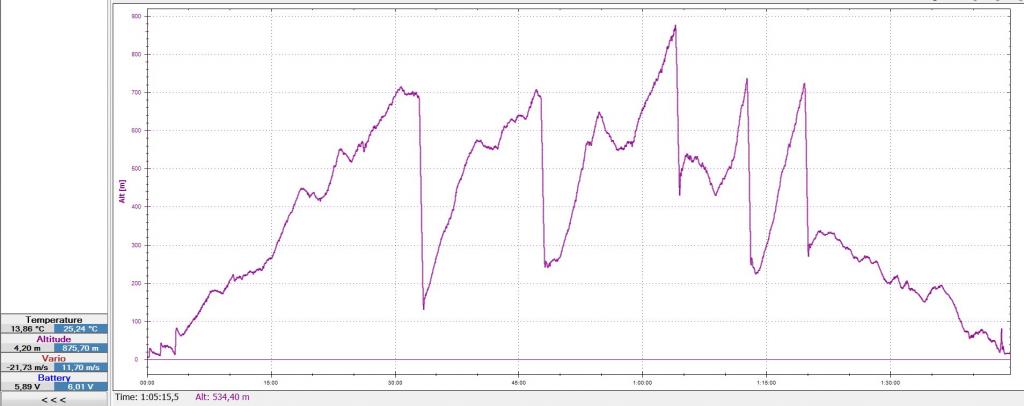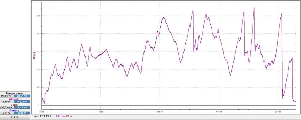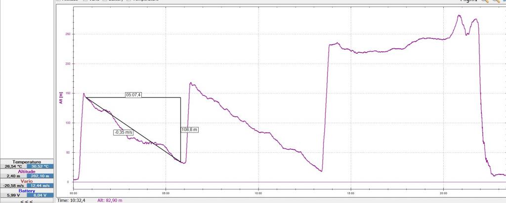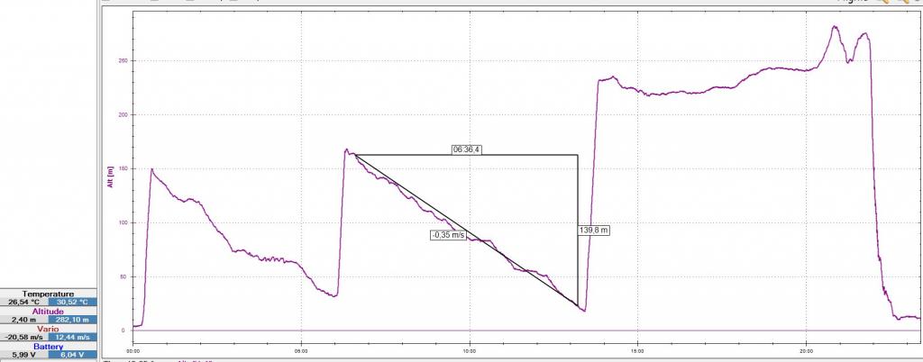 creagel píše:Na posledni let jsem si nechal maly pokus - vystoupat relativne hodne vysoko (kam ani pri zavodech nepolezu) a nechat to co nejdele bez zasahu letet "samo". Uplne do toho sahat jsem nemel nervy - obcas uz to bylo dost daleko, takze lehke korekce smerovkou tam jsou. Ale vysledek viz. graf - ne nadarmo se rika, ze ero leti nejlepe samo, kdyz do toho clovek nesahaLet byl dneska v podvecer, pri lehkem vetriku cca 1.5m/s a pomerne slusnem vzduchu. "Vypinaci" vyska byla 288m, letovka 1650g.