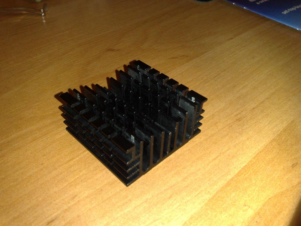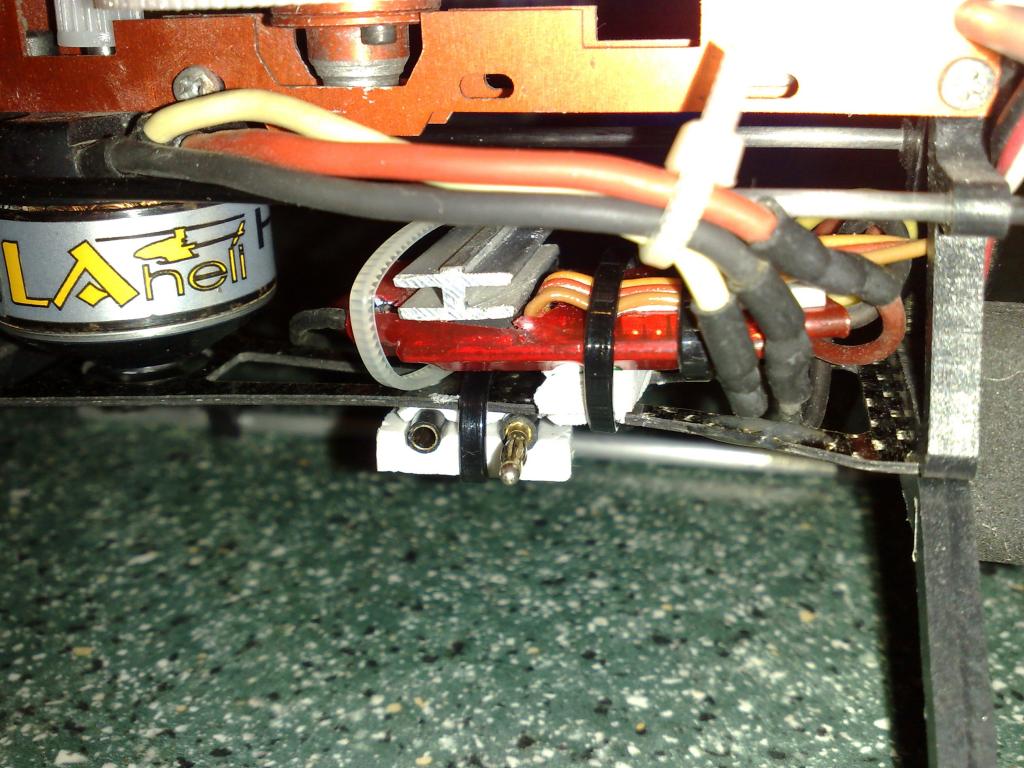 Jeho výška zhruba odpovídá šířce reglu. Fiknul jsem ho zhruba uprostřed po výšce tak, aby šířka uřezaného kusu odpovídala velikosti plošňáku reglu od kraje desky přes stabilizátory (cca. 11mm). Středním plochým dílem je na IO, žebra jsou podél kraje desky u přívodů od accu.