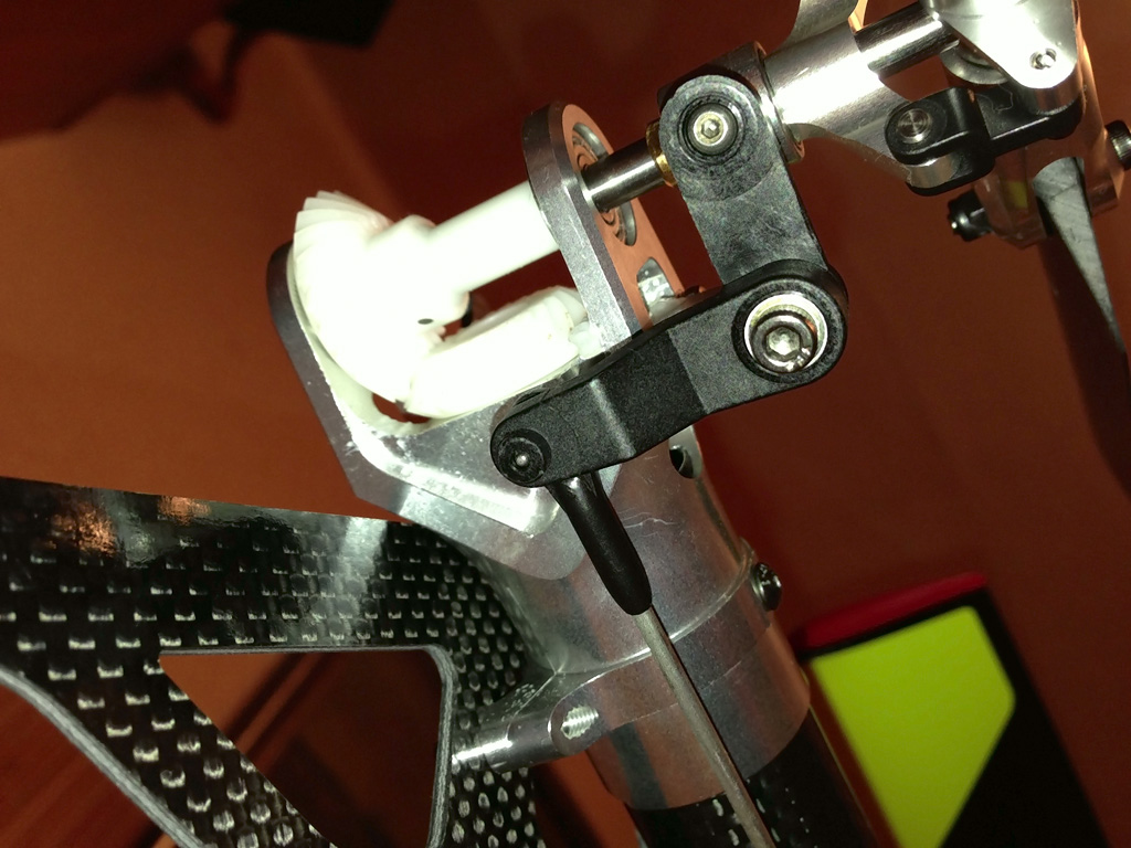 Nikde není žádná další dírka. Samozřejmě, mohl bych dát na servo normální páku, ale přišel bych o beztrimové nastavení geometrie a i kdybych to oželel, tak táhlo vede v spoustě děr celou helinou a vyosení z konkrétní polohy by vedlo k zbytečnému tření.