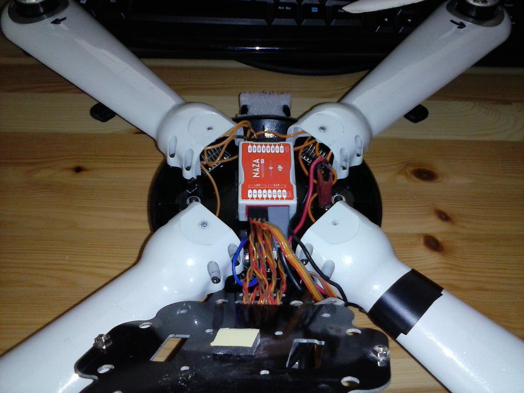 Prohodil jsem pouze kabely, ramena zůstaly na svých místech. Dlouho jsem používal osvětlení ramen, takže bílé vpředu, navíc smysl otáčení rotorů sedí pro FC430, KK2.0 i Nazu. Číslování je ovšem různé.