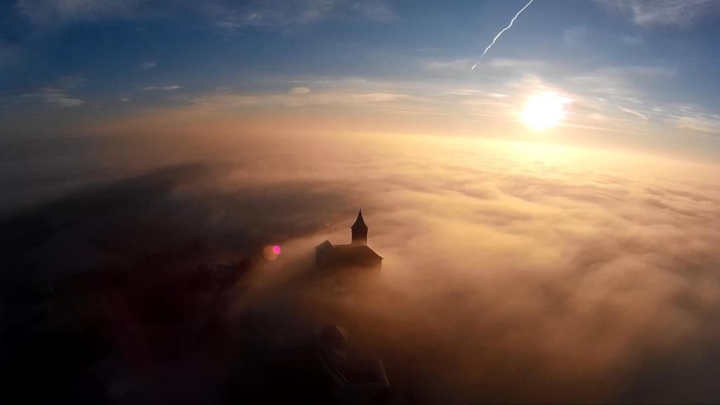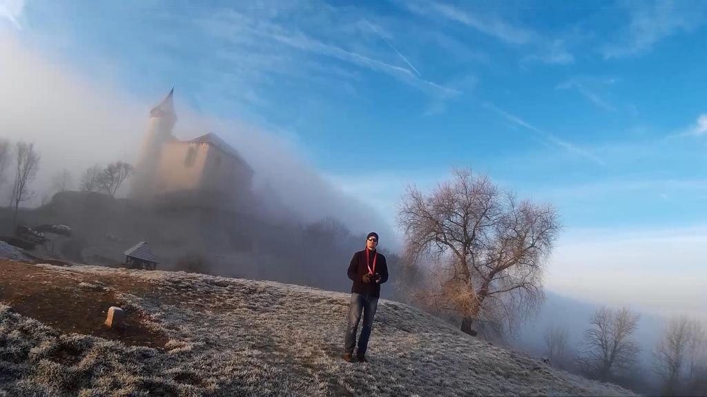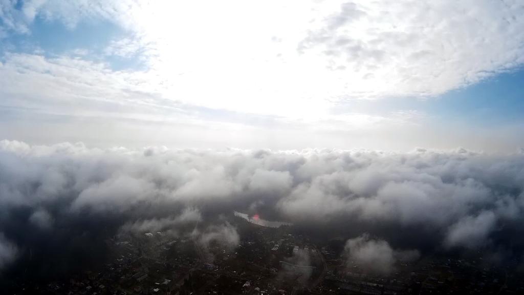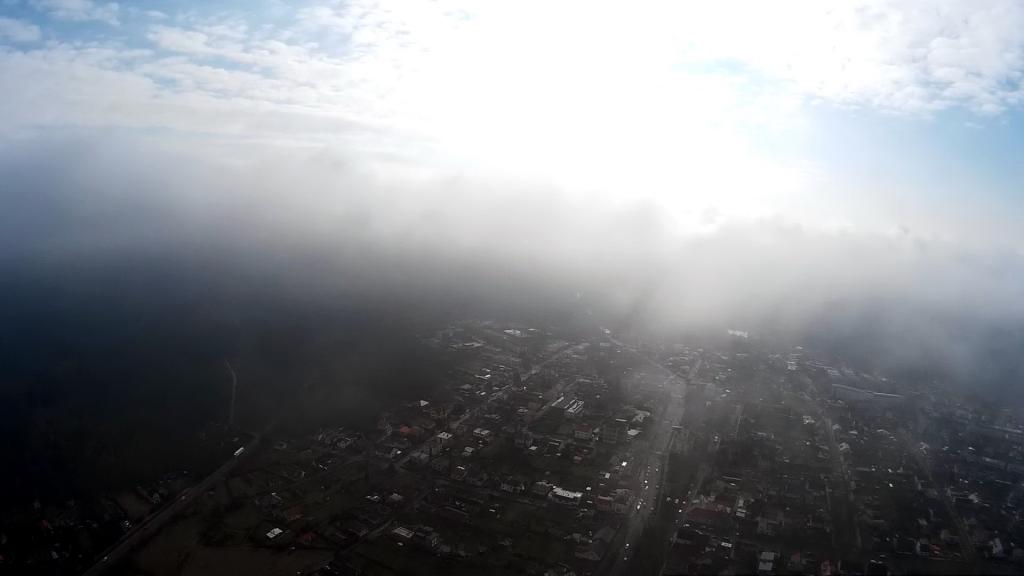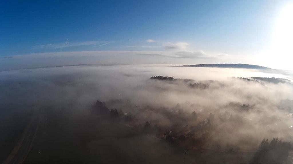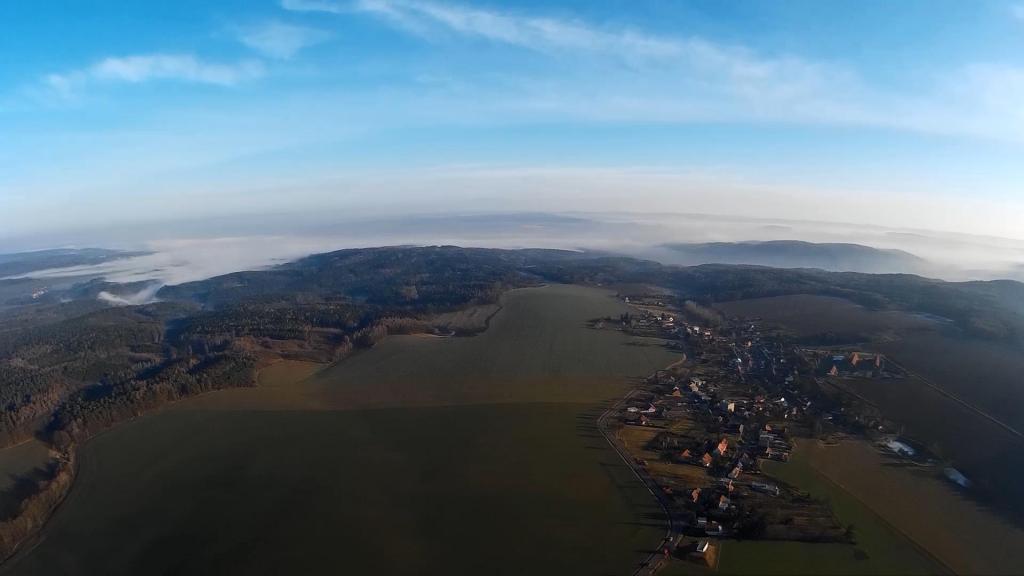 Ranní mlha nad lesy u HK. Výška letu jistě do 300m, šly krásně spočítat pruhy na křídlech Maxíka. Snímky se zorným úhlem 170st.