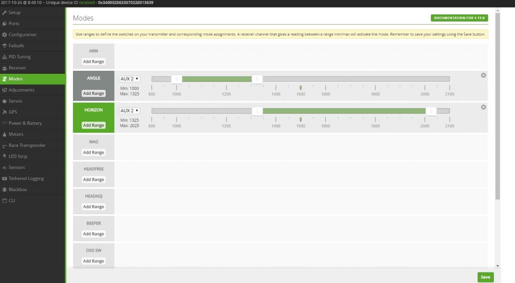 To tvoje nastavení na obrázku je trošku nesmyslné. Stejně to bude fungovat, když necháš stálý režim ANGLE a spínačem budeš jen armovat. Ale pořád přicházíš o možnost přepínání dvou různých letových režimů (módů).