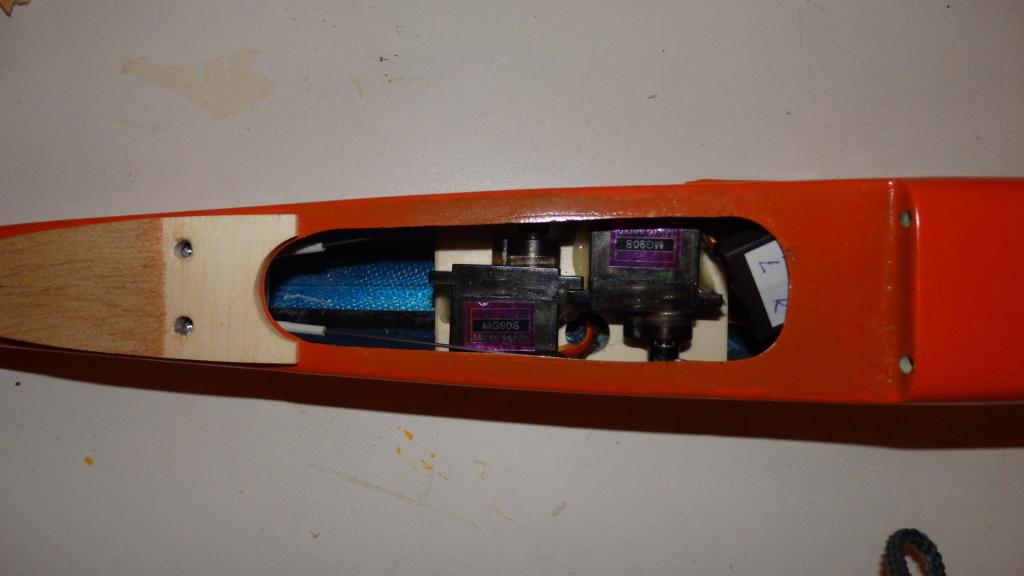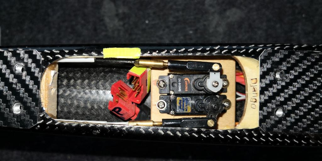 trup je opravdu malý, ale varianty na běžná serva se najdou, takhle mám ve dvou gondolách serva já, první položená, přilepená naplocho na překližce, pokud je potřeba sundavat páčky na servu, musí se to trupu vyvrtat v ose výstupních hřídelů serv otvory na šroubovák. Ve druhém případě serva těsně u konce kabinky, je parádní přístup k páčkám. Serva v obou případech MG90S.