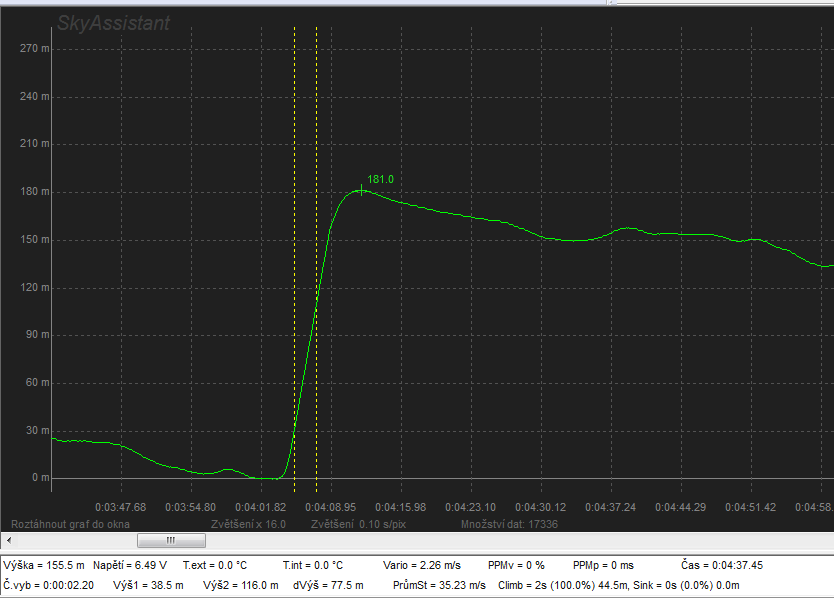 Docela mi to překvapilo, čekal jsem cca 25m/s a ejhle ono to mastí na 4S kolmo 35m/s, špičkově i 38m/s. Pro vystoupání 1716m výšky pohon spotřeboval 1800mAh z celkové kapacity baterie 2700mAh. Což není špatné:-)