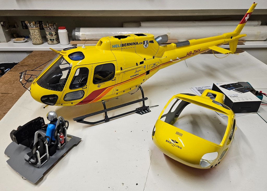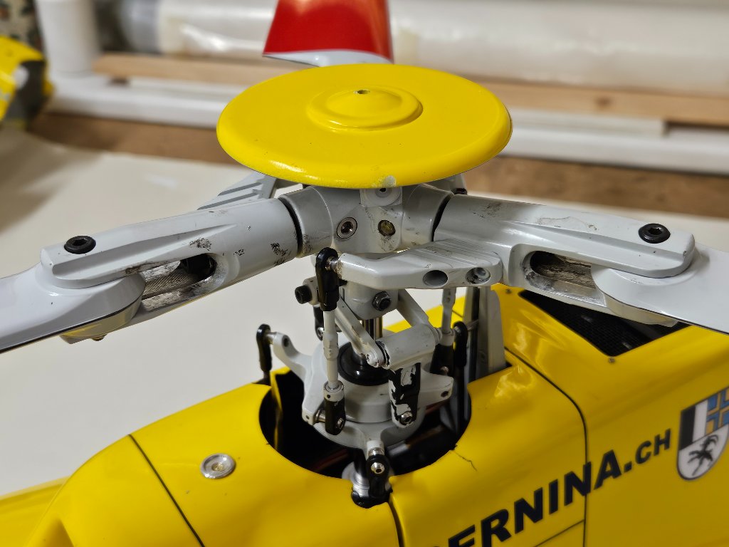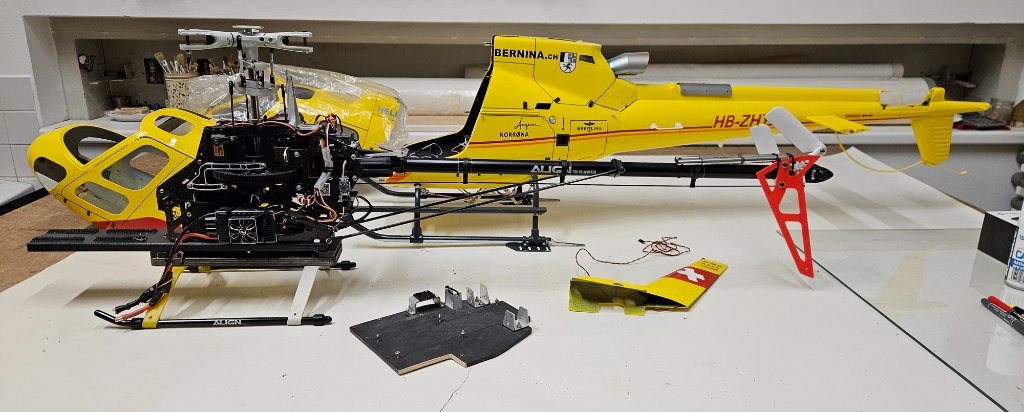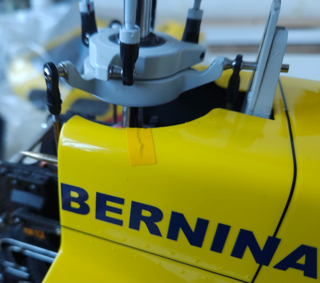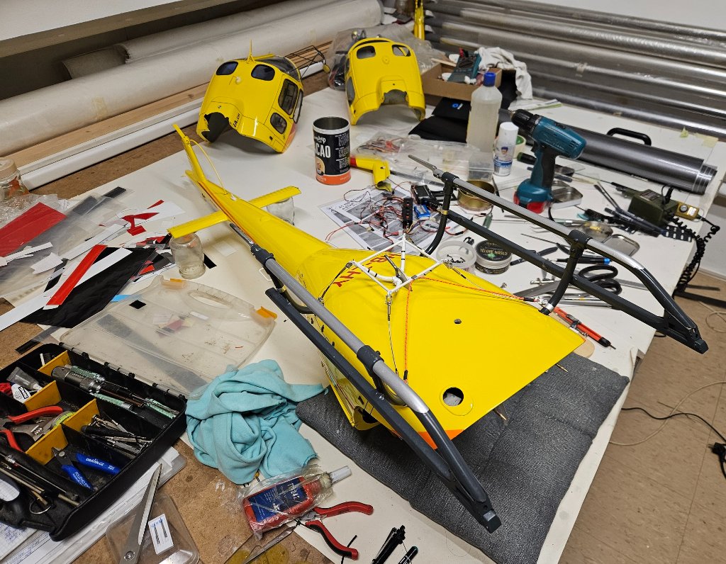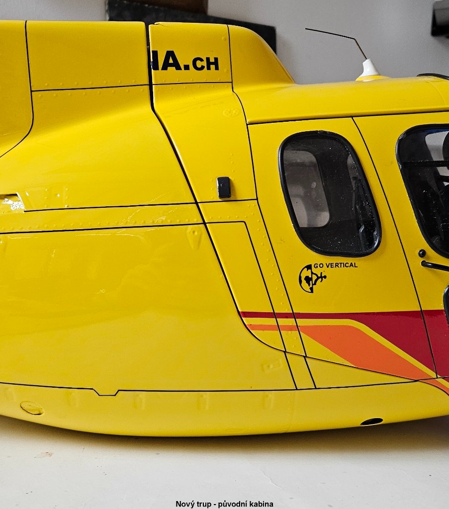 První fáze hotová, na jaře to může do vzduchu. Snad poslední věc kterou jsem hledal byl úzký silikonový pásek mezi trup a zadní domek vrtulky stažený dohromady černým páskem. Prasklinu trupu okolo vstupu mechaniky rotoru vzniklou tlakem na nesprávném místě při rozpojení kabiny nepůjde řešit žlutou folií, nemám správný odstín. Nezbude než to vyretušovat ručně, bohužel i trochu tmelit. Lepení jsem asi uspěchal, místo 24H epoxidu jsem vzal 5min od Hnízdila který sice rychle drží ale vytvrdne až za pár dní a pokud je tam nějaké pnutí, spoj se zdeformuje. Takže je tam zoubek a tkanina s tím epoxidem to neudržela.