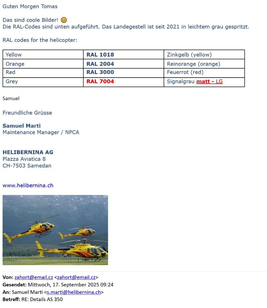 Je tom sice jak se říká s křížkem po funuse, měl jsem tom udělat dávno nicméně i tak jsem napsal Samuelovi z Helibernina.ch s nímž komunikuji zda by mi neposlal RAL kódy barev. Přišlo to za půl hodiny.