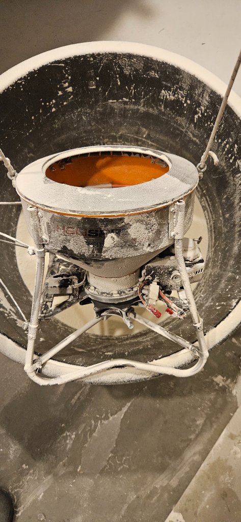 Scott z NZ svůj typ lehce inovuje. Vezl ho na sraz do USA kde mu ale nezajistili popel který doma používá a manželka jednoho z pilotů přinesla mouku. Vyzkoušené to neměl, i když má na rozdíl ode mne vibrační motor, výkon byl malý a tok mouky se často zastavoval. Po návratu domů to přehodnotil, došlo mu že popel je opravdu špinavý, lehce abrazivní a ač ho má skladem obrovské množství, přeorientuj se na mouku. Pokud bych tak uvažoval u nás, popel nestojí prakticky nic ale kilo mouky se pod dvacet korun skoro nesežene.... Budiž. Já používám strouhanku nebo hrubou krupici, to je podobná cena. K tomu trochu hořčičného semínka které usnadňuje tok resp. brání zastavování toku materiálu slehnutím. A nesmí to jít do spinneru skrz maximální otvor 36mm nýbrž to chce kalíškovou redukci vylisovanou za tepla z Vivaku kde ke průměr 21mm. Mám ještě dvě menší, to už není ono.