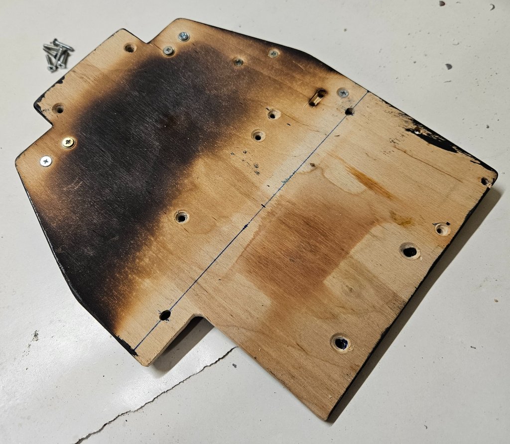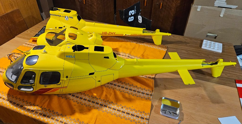 Dostává to trochu tempo i když občas se něco zasekne a je po náladě. Před časem jsem si dal při větším úklidu v pracovně všechno na ASko do jedné krabice, zaregistroval jsem že chybí ochranný rám vrtulky a ostruhy které jsem demontoval z prvního trupu brzy po pádu při kompletní rozborce a bylo to v sáčku zvlášť v poličce. U prvního trupu jsem ho osadil ještě před nástřikem barvy a dal tomu vlastní jednosložkový plnič, na fotce je to dobře vidět. Tentokrát to nedávalo smysl protože díly měly barvu i lak, musel bych to zbytečně zbrousit tak jasná montáž dodatečně. Jasně že nebyla, díly jsem nenašel ani při klasickém prohlížení všeho 4x. Našel jsem sice rezervní podvozek z prvního nákupu 2023, ten mě nevytrhnul. Nakonec jsem kapituloval a rám i kryt pod ním vyrobil znova včetně měření jeho tvaru. Už je to v barvě a laku který sice nemá kvality toho z lakovny ale musí to stačit, kdybych tam s tím přišel zvlášť mysleli by si že mi přeskočilo :-).