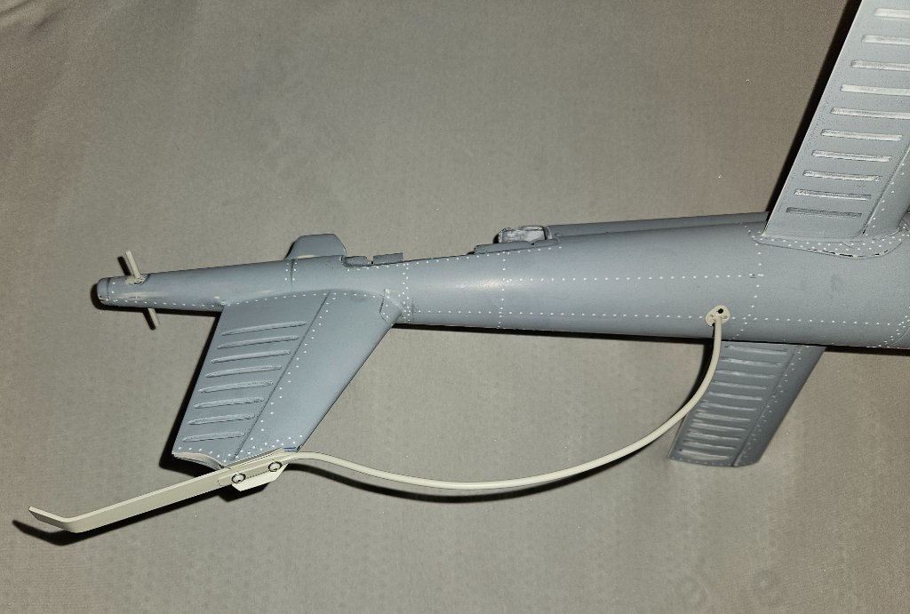 Dnes už jsem se pustil do podvozku, většina dílů je v pořádku, lepit budu akorát stupačky které praskly v nastavení. Znova to vyrábět nebudu, lepení dokončí lokální retuš. Beztak to není soutěžní maketa a nějaké ty malé šrámy vypadají přirozeně :-). Ovládání háku se servem už je uvnitř. Vyrobil jsem novou boční anténu, u té původní se strhnul závit.