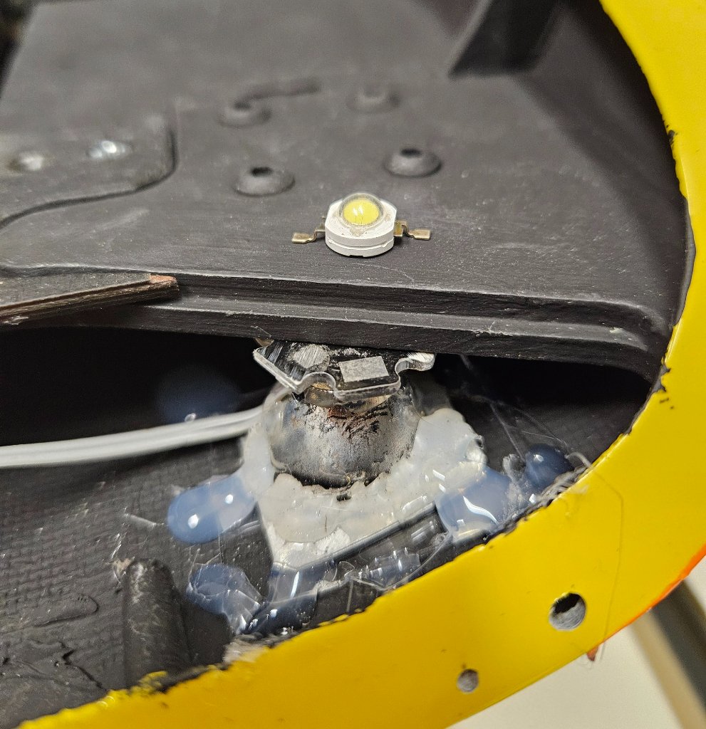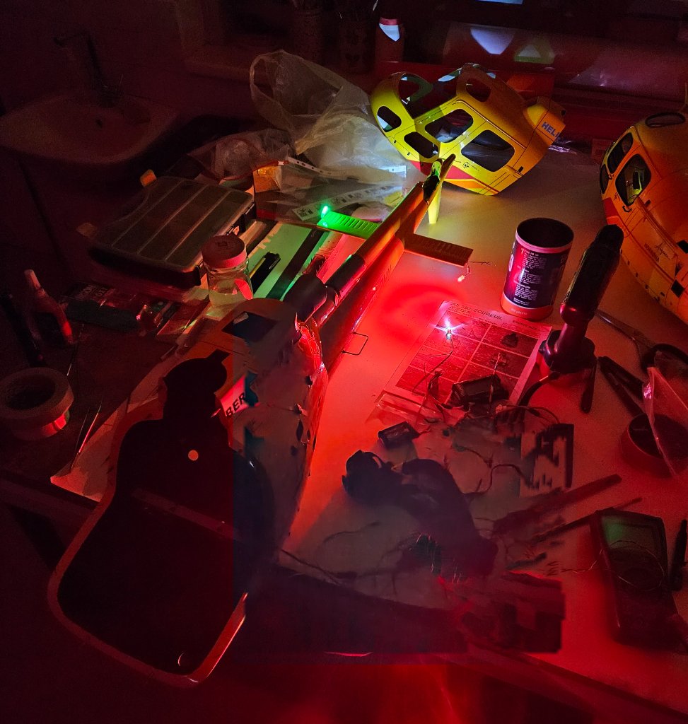 Během jednoho dvou dnů to bude hotové, zbudou pouze pruhy na listy. Další zásek přišel po zjištění odpálené diody spodního reflektoru takže výměna. Rozměření a osazení magnetického konektoru dalo taky dost práce, odměnou bylo úspěšné rozsvícení kokpitu po nasazení původní kabiny, poprvé od 10. května kdy to skončilo v řepce.